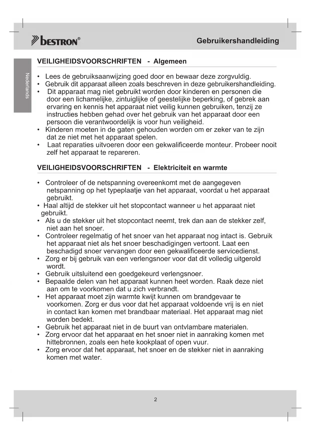 SERVICE Mocht zich onverhoopt een storing voordoen, dan kunt u zich in verbinding stellen met de BESTRON- servicedienst: NEDERLAND: