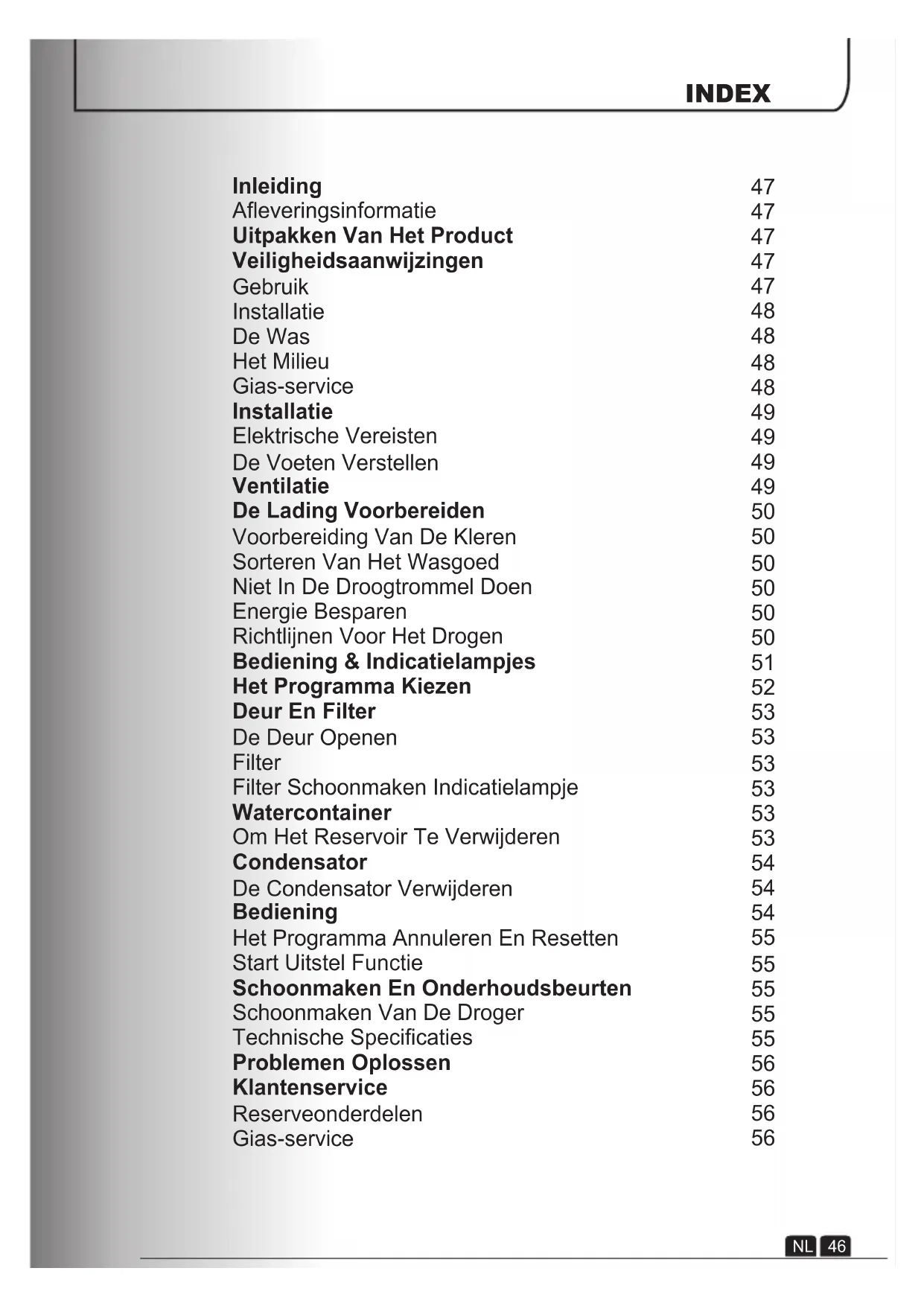 ● Deze machine is alleen voor huishoudelijk gebruik, m.a.w. voor het drogen van huishoudelijk textiel en kleding. ● Dit apparaat mag uitsluitend gebruikt worden voor het doel waarvoor het vervaardigd is, zoals dat in deze handleiding beschreven wordt. Verzeker u ervan dat u de instructies voor de installatie en het gebruik volledig begrijpt voordat u de machine gebruikt.● Raak de machine niet aan als uw handen of voeten nat of vochtig zijn. ● Leun niet tegen de deur als u de machine laadt en gebruik de deur niet om de machine op te tillen of te verplaatsen.● Sta niet toe dat kinderen met de machine of de bediening ervan spelen. ● WAARSCHUWING Gebruik het apparaat niet als de pluizenfilter niet geplaatst of beschadigd is; pluis kan ontbranden. ● WAARSCHUWING Op de plaats van het symbool voor warm oppervlak kan de temperatuur tijdens het drogen tot meer dan 60 graden C stijgen. ● Haal de stekker uit het stopcontact. Haal altijd de stekker uit het stopcontact voordat u de machine schoonmaakt.● Blijf deze machine niet gebruiken als ze een gebrek lijkt te hebben. ● Pluizen of dons mogen zich niet op de grond rondom de buitenkant van de machine ophopen.