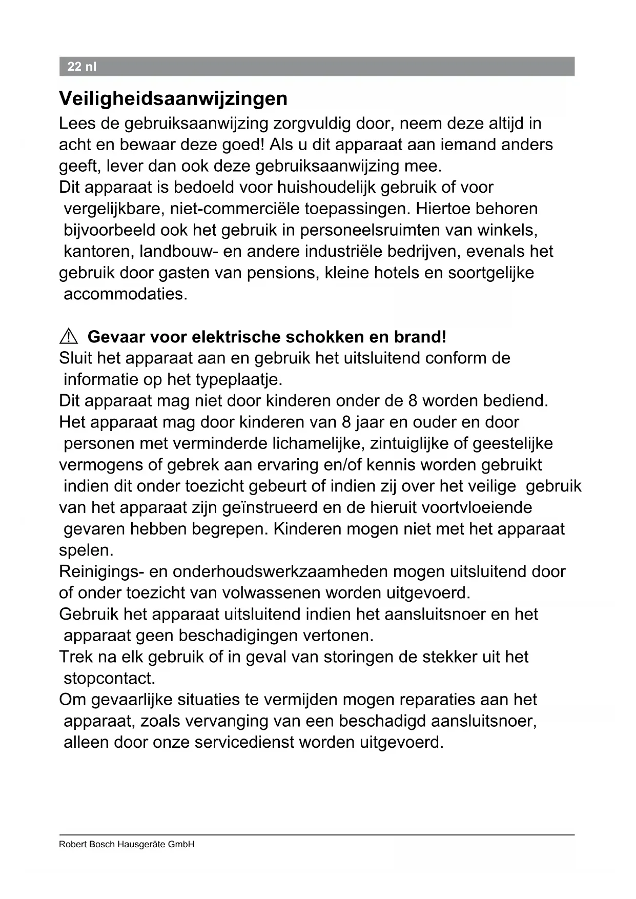 Gevaar voor elektrische schokken! De stekker uit het stopcontact nemen en het apparaat laten afkoelen alvorens het te reinigen. Het apparaat nooit in water onderdompelen. Geen stoomreiniger gebruiken. Het apparaat aan de buitenkant alleen met een vochtige doek schoonmaken. Geen scherpe of schurende schoonmaakmiddelen gebruiken. Opbergen De stekker uit het stopcontact nemen en het apparaat laten afkoelen alvorens het op te bergen.26 Robert Bosch Hausgeräte GmbH 26 nl Afval Gooi verpakkingsmateriaal op een milieu- vriendelijke manier weg. Dit apparaat is gekenmerkt in overeenstemming met de Europese richtlijn 2012/19/EG betreffende afgedankte elektrische en elektronische apparatuur (waste electrical and electronic equipment – WEEE). De richtlijn geeft het kader aan voor de in de EU geldige terug- neming en verwerking van oude apparaten. Raadpleeg uw gespecialiseerde hande- laar voor de geldende voorschriften inzake afvalverwijdering. Garantie Voor dit apparaat gelden de garantievoor- waarden die worden uitgegeven door de vertegenwoordiging van ons bedrijf in het land van aankoop. De leverancier, bij wie u het apparaat heeft gekocht, geeft u hierover graag meer informatie. Om aanspraak te maken op de garantie heeft u altijd uw aan- koopbewijs nodig. Wijzigingen voorbehouden. Technische specicaties Elektrische aansluiting (spanning / frequentie) 220 – 240 V 50 / 60 Hz Vermogen 88 W A27 PHC 9790 02/2013 27da Sikkerhedshenvisninger Du bedes læse brugsvejledningen grundigt, overholde og opbevare den! Ved overdragelse af apparatet skal denne vejledning vedlægges. Dette apparat er udformet til brug i husholdningen og til husholdnings- lignende, ukommercielle formål. Husholdningslignende anvendelser omfatter f.eks. brug i opholdsrum til medarbejdere i butikker, kontorer, landbrug eller andre små virksomheder, eller gæsters brug i pensioner, mindre hoteller eller lignende.