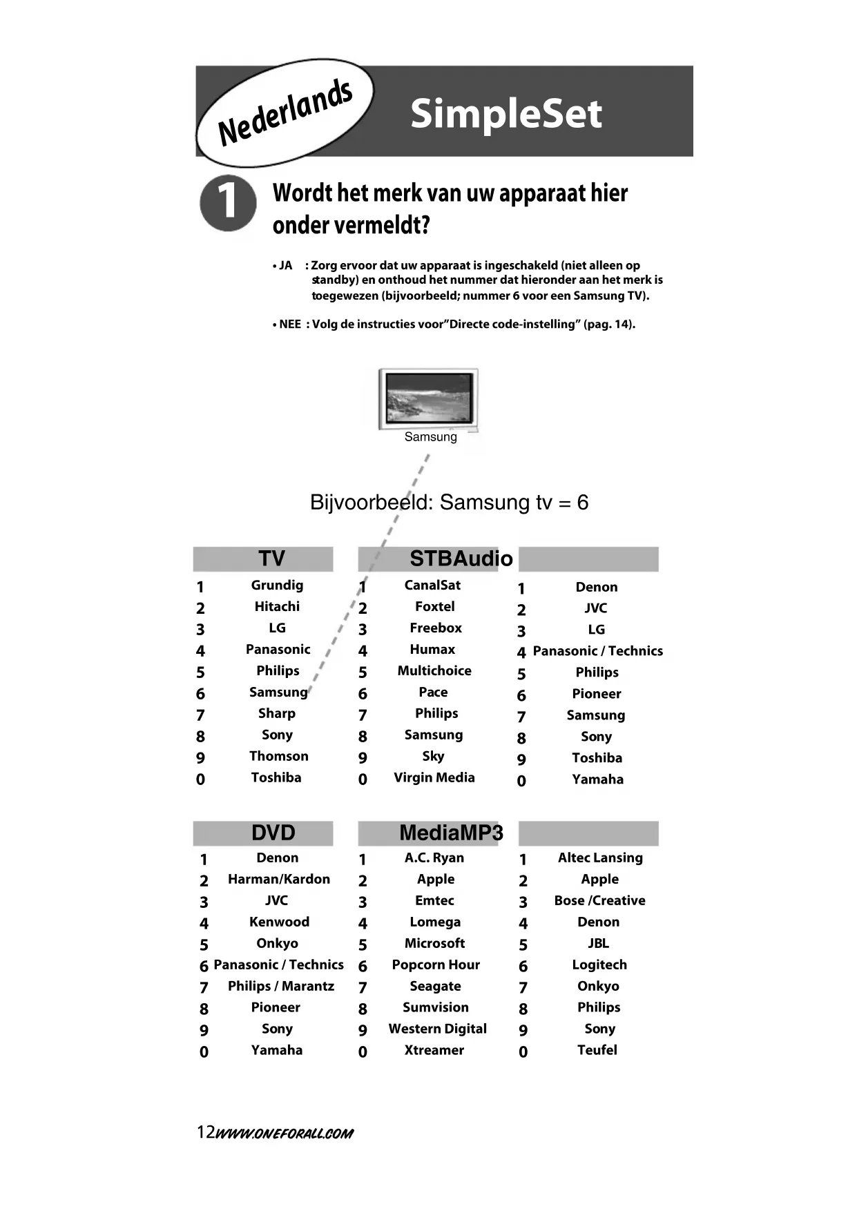 onder vermeldt? • JA : Zorg ervoor dat uw apparaat is ingeschakeld (niet alleen op s tandby) en onthoud het nummer dat hieronder aan het merk is t oegewezen (bijvoorbeeld; nummer 6 voor een Samsung TV).• NEE : Volg de instructies voor”Directe code-instelling” (pag. 14). Bijvoorbeeld: Samsung tv = 6