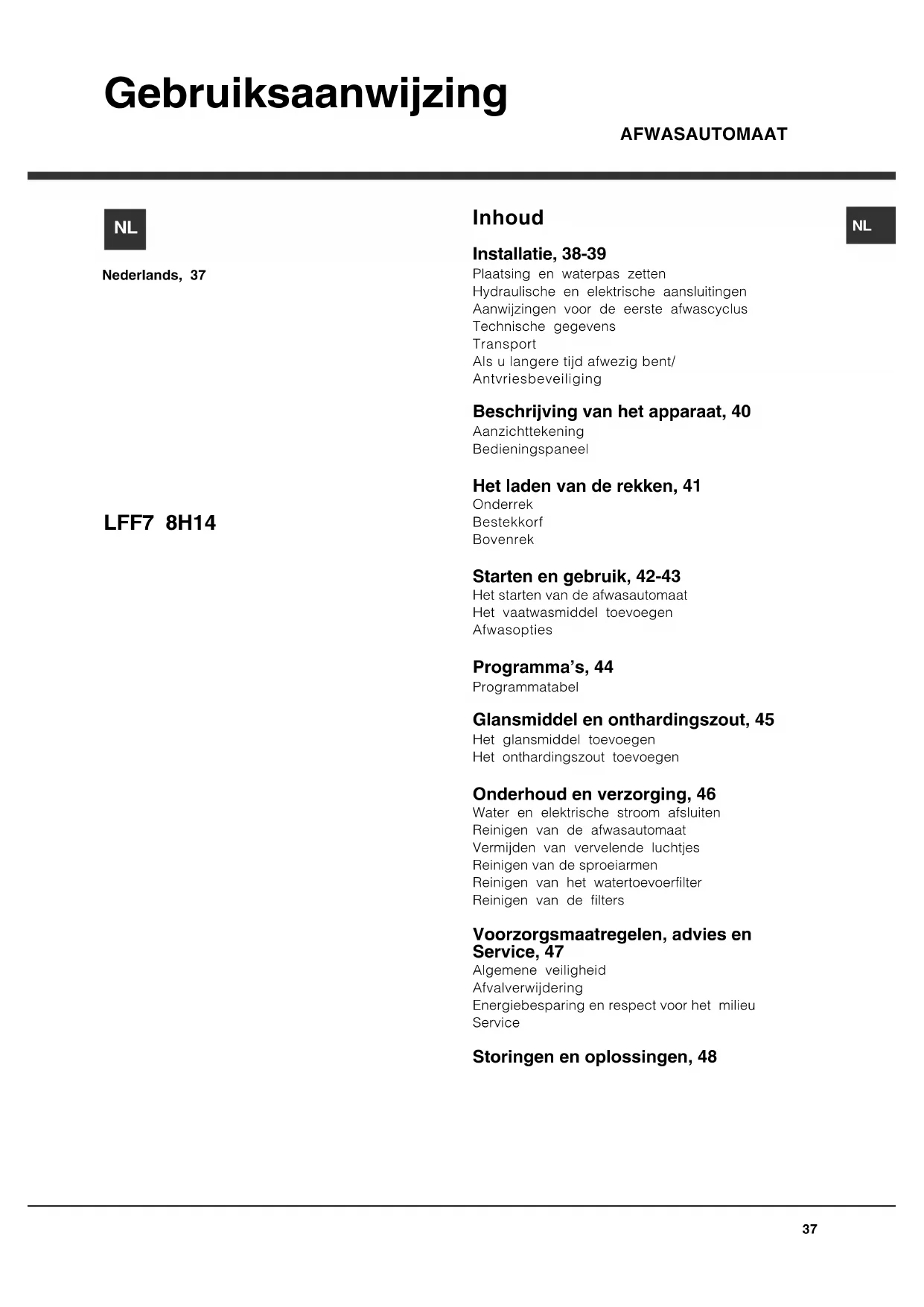 Gebruiksaanwijzing Inhoud Installatie, 38-39 Plaatsing en waterpas zetten Hydraulische en elektrische aansluitingen Aanwijzingen voor de eerste afwascyclus Technische gegevens Transport Als u langere tijd afwezig bent/ Antvriesbeveiliging Beschrijving van het apparaat, 40 Aanzichttekening Bedieningspaneel Het laden van de rekken, 41 Onderrek Bestekkorf Bovenrek Starten en gebruik, 42-43 Het starten van de afwasautomaat Het vaatwasmiddel toevoegen Afwasopties Programmas, 44 Programmatabel Glansmiddel en onthardingszout, 45 Het glansmiddel toevoegen Het onthardingszout toevoegen Onderhoud en verzorging, 46 Water en elektrische stroom afsluiten Reinigen van de afwasautomaat Vermijden van vervelende luchtjes Reinigen van de sproeiarmen Reinigen van het watertoevoerfilter Reinigen van de filters Voorzorgsmaatregelen, advies en Service, 47 Algemene veiligheid Afvalverwijdering Energiebesparing en respect voor het milieu Service Storingen en oplossingen, 48 Nederlands, 37