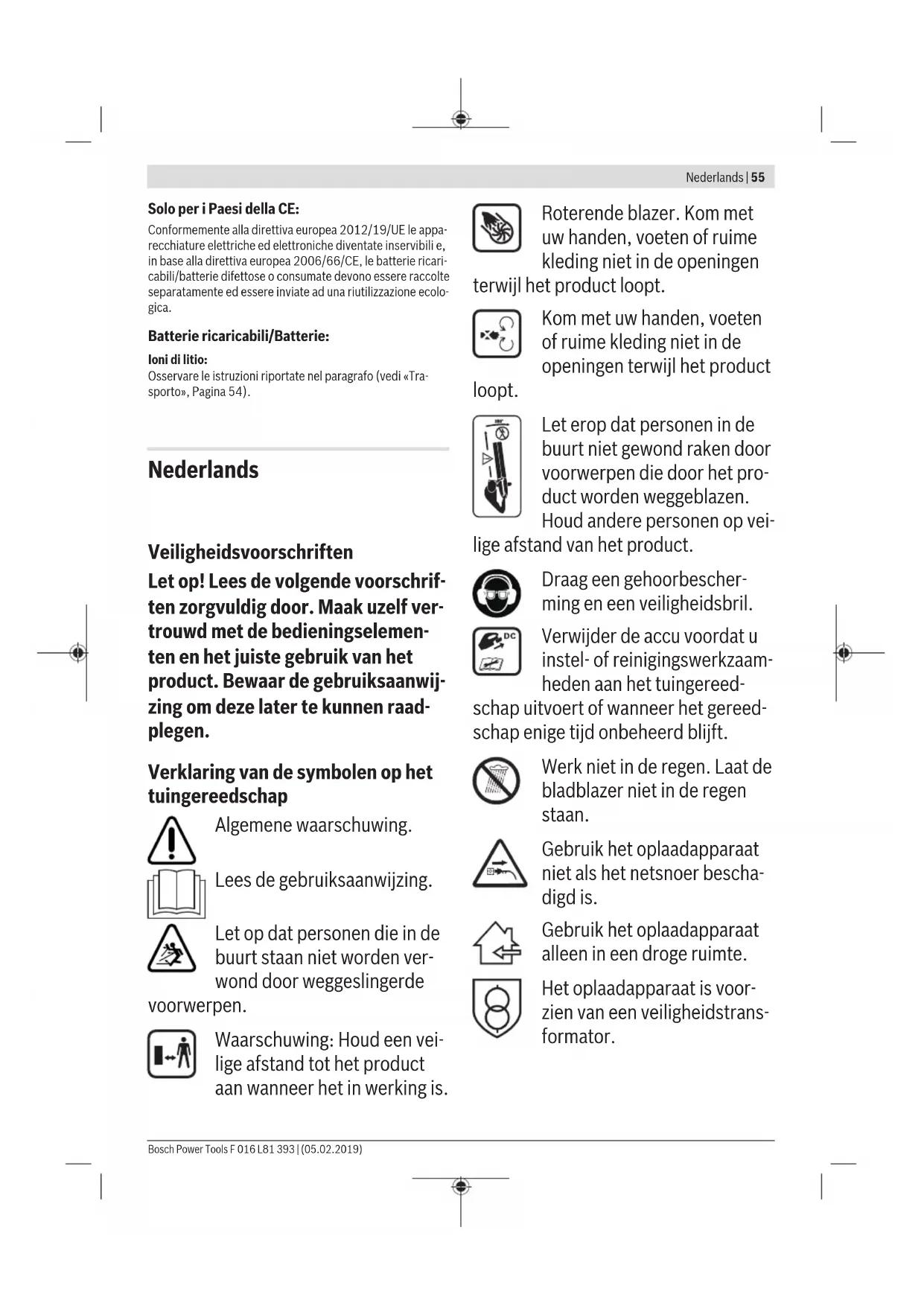 u Attenzione: Prima di effettuare interventi di regola- zione o pulizia spegnere l’apparecchio per il giardinag- gio ed estrarre sempre la batteria ricaricabile. Manutenzione, pulizia e magazzinaggio u Tenere il prodotto pulito per poter lavorare bene ed in modo sicuro. Per un uso ottimale pulire il ventilatore e l'area intorno al ventilatore dopo ogni utilizzo. Tenere il prodotto e le fessure di ventilazione puliti per poter lavorare bene ed in modo sicuro. Rimuovere la sporcizia dal prodotto o dal sacco di raccolta con un panno umido. Non spruzzare mai il prodotto con acqua. Non immergere mai il prodotto in acqua. Immagazzinare il prodotto in un posto sicuro ed asciutto e al di fuori della portata dei bambini. Non appoggiare nessun altro oggetto sul prodotto. Cura della batteria ricaricabile Osservare le seguenti indicazioni e provvedimenti per garan- tire un utilizzo ottimale della batteria ricaricabile: – Proteggere la batteria ricaricabile da umidità ed acqua. – Immagazzinare l’apparecchio per il giardinaggio e la bat- teria ricaricabile esclusivamente nel campo di temperatu- ra tra -20 °C e 50 °C. Ad es. in estate non lasciare in auto la batteria ricaricabile. – Immagazzinare la batteria ricaricabile separatamente e non nella stazione di ricarica. – In caso di irradiamento solare diretto non lasciare la bat- teria ricaricabile nell’apparecchio per il giardinaggio. – La temperatura ottimale per la conservazione della batte- ria ricaricabile è di 5 °C. – Pulire di tanto in tanto le fessure di ventilazione della bat- teria ricaricabile con un pennello morbido, pulito ed asciutto. Un tempo di funzionamento notevolmente ridotto dopo la ri- carica indica che la batteria ricaricabile è consumata e deve essere sostituita. Servizio di assistenza e consulenza tecnica www.bosch-garden.com In caso di richieste o di ordinazione di pezzi di ricambio, co- municare sempre il codice prodotto a 10cifre riportato sulla targhetta di identificazione del prodotto. Italia Tel.: (02) 3696 2314 E-Mail: pt.hotlinebosch@it.bosch.com Svizzera Sul sito www.bosch-pt.com/ch/it è possible ordinare diret- tamente on-line i ricambi. Tel.: (044) 8471513 Fax: (044) 8471553 E-Mail: Aftersales.Service@de.bosch.com Trasporto Le batterie al litio contenute sono soggette ai requisiti di leg- ge relativi a merci pericolose. Le batterie possono essere trasportate su strada tramite l’utente senza ulteriori precau- zioni. In caso di spedizione tramite terzi (ad es. per via aerea o tra- mite spedizioniere), andranno rispettati specifici requisiti relativi d’imballaggio e contrassegnatura. In tale caso, per la preparazione dell’articolo da spedire, andrà consultato uno specialista in merci pericolose. Inviare le batterie soltanto se la relativa carcassa non è dan- neggiata. Coprire con nastro adesivo i contatti scoperti ed imballare la batteria in modo che non possa spostarsi nell’imballaggio. Andranno altresì rispettate eventuali ulte- riori norme nazionali complementari. Smaltimento Avviare ad un riciclaggio rispettoso dell’am- biente apparecchi per il giardinaggio, batterie ricaricabili, accessori ed imballaggi non più im- piegabili. Non gettare apparecchi per il giardinaggio e batterie ricaricabili/batterie tra i rifiuti dome- stici! F 016 L81 393 | (05.02.2019) Bosch Power ToolsNederlands | 55 Solo per i Paesi dellaCE: Conformemente alla direttiva europea 2012/19/UE le appa- recchiature elettriche ed elettroniche diventate inservibili e, in base alla direttiva europea 2006/66/CE, le batterie ricari- cabili/batterie difettose o consumate devono essere raccolte separatamente ed essere inviate ad una riutilizzazione ecolo- gica. Batterie ricaricabili/Batterie: Ioni di litio: Osservare le istruzioni riportate nel paragrafo (vedi «Tra- sporto», Pagina54). Nederlands Veiligheidsvoorschriften Let op! Lees de volgende voorschrif- ten zorgvuldig door. Maak uzelf ver- trouwd met de bedieningselemen- ten en het juiste gebruik van het product. Bewaar de gebruiksaanwij- zing om deze later te kunnen raad- plegen. Verklaring van de symbolen op het tuingereedschap Algemene waarschuwing. Lees de gebruiksaanwijzing. Let op dat personen die in de buurt staan niet worden ver- wond door weggeslingerde voorwerpen. Waarschuwing: Houd een vei- lige afstand tot het product aan wanneer het in werking is. Roterende blazer. Kom met uw handen, voeten of ruime kleding niet in de openingen terwijl het product loopt. Kom met uw handen, voeten of ruime kleding niet in de openingen terwijl het product loopt. Let erop dat personen in de buurt niet gewond raken door voorwerpen die door het pro- duct worden weggeblazen. Houd andere personen op vei- lige afstand van het product. Draag een gehoorbescher- ming en een veiligheidsbril. Verwijder de accu voordat u instel- of reinigingswerkzaam- heden aan het tuingereed- schap uitvoert of wanneer het gereed- schap enige tijd onbeheerd blijft. Werk niet in de regen. Laat de bladblazer niet in de regen staan. Gebruik het oplaadapparaat niet als het netsnoer bescha- digd is. Gebruik het oplaadapparaat alleen in een droge ruimte. Het oplaadapparaat is voor- zien van een veiligheidstrans- formator. Bosch Power Tools F 016 L81 393 | (05.02.2019)56 | Nederlands Bediening u Laat kinderen of personen die deze voorschriften niet hebben gelezen het product nooit gebruiken. In uw land gelden eventueel voorschriften ten aanzien van de leeftijd van de be- diener. Bewaar het product buiten het bereik van kinderen wanneer het niet wordt gebruikt. u Dit product is niet bestemd voor ge- bruik door personen (inclusief kinde- ren) met beperkte fysieke, zintuiglij- ke of geestelijke vermogens of met beperkte ervaring en/of beperkte kennis, tenzij zij onder toezicht staan van een voor hun veiligheid verant- woordelijke persoon of zij van deze persoon instructies ontvangen ten aanzien van het gebruik van het pro- duct. Op kinderen moet toezicht worden gehouden om er zeker van te zijn dat ze niet me