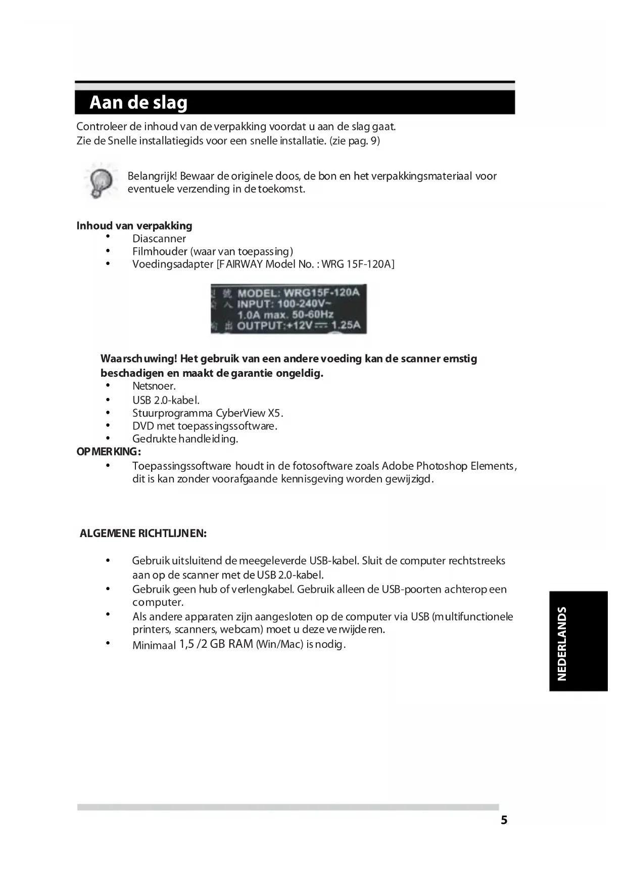Waarsch uwing! Het gebruik van een andere voeding kan de scanner ernstig beschadigen en maakt de garantie ongeldig. Netsnoer. USB 2.0-kabel. Stuurprogramma CyberView X5. DVD met toepassingssoftware. Gedrukte handle id ing. OP MER KING : Toepa ssingssoftware houdt in de fotosoftware zoals Adobe Photoshop Elements , dit is kan zonder voorafgaande kennisgeving worden gewij zigd .