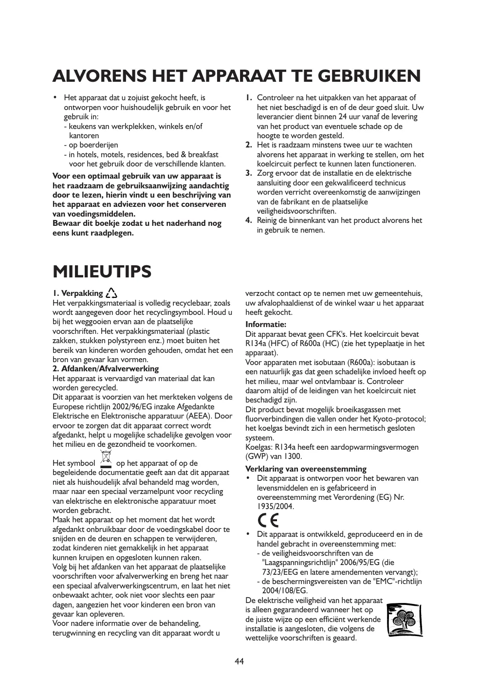 Informations : Cet appareil est sans CFC. Le circuit réfrigérant contient du R134a (HFC) ou du R600a (HC). Pour en savoir plus, consultez la plaquette signalétique située à l'intérieur de l'appareil. Pour les appareils à isobutane (R600a) : l'isobutane est un gaz naturel sans danger pour l'environnement, mais inflammable. Assurez-vous par conséquent que les tuyaux du circuit réfrigérant sont en parfait état. Ce produit peut contenir des gaz à effet de serre fluorés visés par le protocole de Kyoto ; le gaz réfrigérant est contenu à l'intérieur d'un circuit hermétique. Gaz réfrigérant : le R134a a un potentiel de réchauffement global (GWP) de 1300. Déclaration de conformité • Cet appareil est destiné à la conservation de produits alimentaires et est fabriqué conformément à la réglementation CE N° 1935/2004.