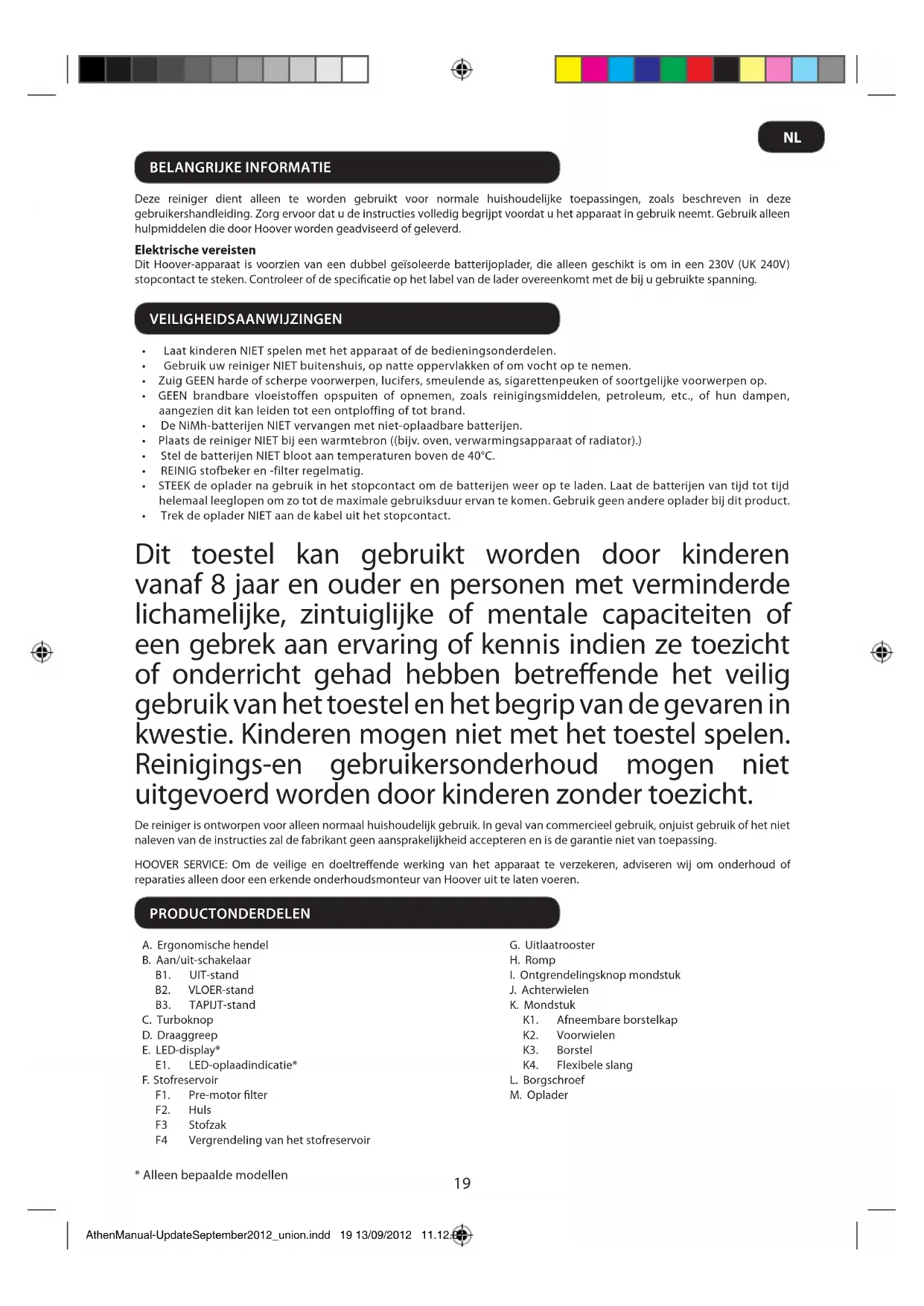 AthenManual-UpdateSeptember2012_union.indd 21 13/09/2012 11.12.07ORiGiNELE RESERvEONDERDELEN EN TOEbEhOREN vaN hOOvER UW GaRaNTiE Gebruik uitsluitend originele reserveonderdelen van Hoover. Deze zijn verkrijgbaar bij uw Hoover Dealer. Als u onderdelen bestelt,