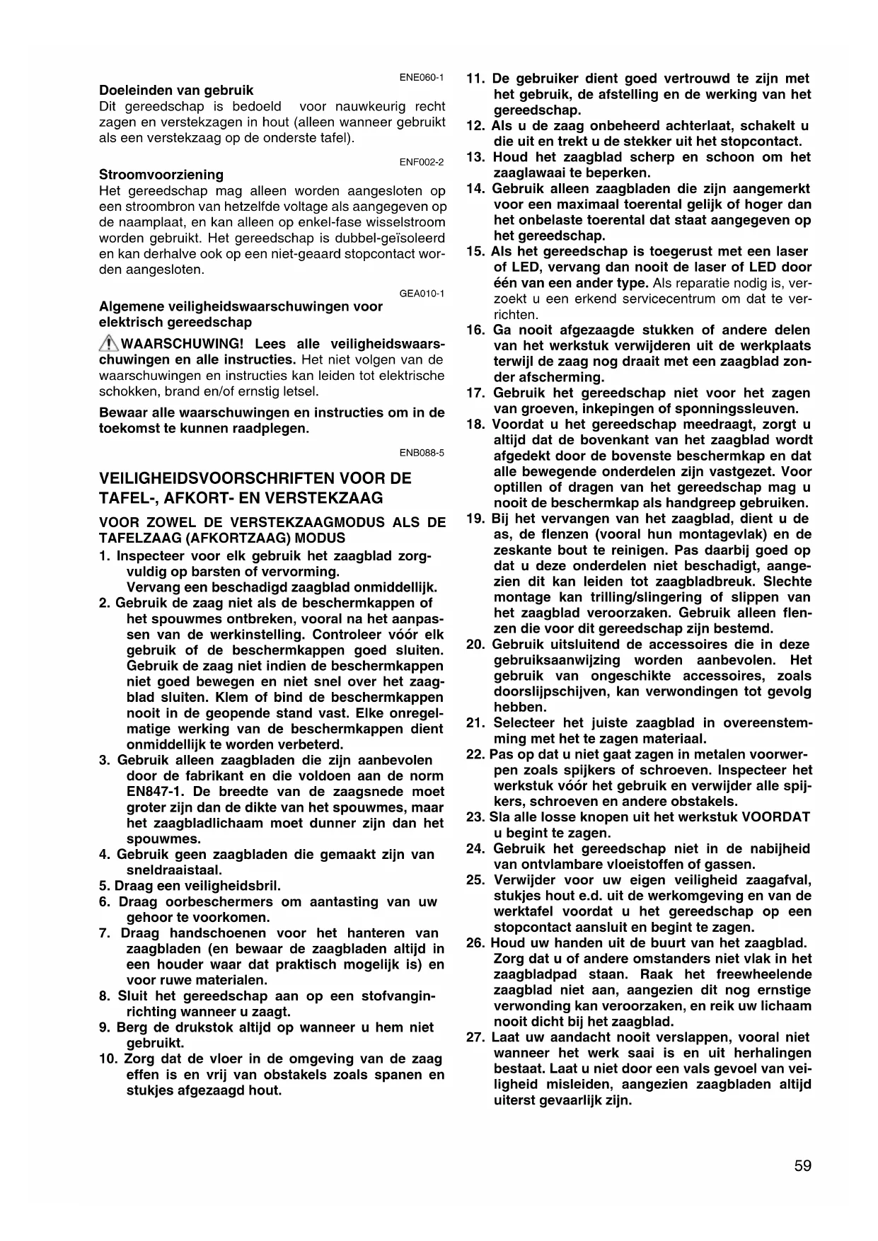 VEILIGHEIDSVOORSCHRIFTEN VOOR DE TAFEL-, AFKORT- EN VERSTEKZAAG VOOR ZOWEL DE VERSTEKZAAGMODUS ALS DE TAFELZAAG (AFKORTZAAG) MODUS