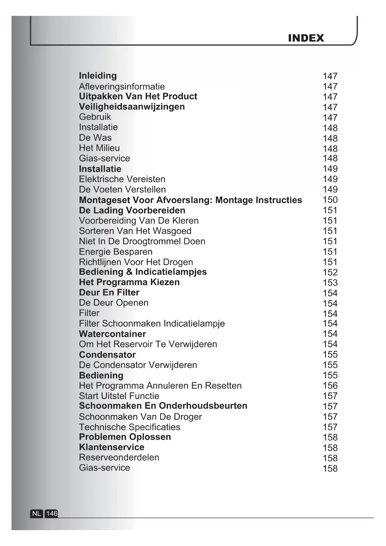 Ⴠ Deze machine is alleen voor huishoudelijk gebruik, m.a.w. voor het drogen van huishoudelijk textiel en kleding. Ⴠ Dit apparaat mag uitsluitend gebruikt worden voor het doel waarvoor het vervaardigd is, zoals dat in deze handleiding beschreven wordt. Verzeker u ervan dat u de instructies voor de installatie en het gebruik volledig begrijpt voordat u de machine gebruikt.Ⴠ Raak de machine niet aan als uw handen of voeten nat of vochtig zijn. Ⴠ Leun niet tegen de deur als u de machine laadt en gebruik de deur niet om de machine op te tillen of te verplaatsen.Ⴠ Sta niet toe dat kinderen met de machine of de bediening ervan spelen. Ⴠ WAARSCHUWING Gebruik het apparaat niet als de pluizenfilter niet geplaatst of beschadigd is; pluis kan ontbranden. Ⴠ WAARSCHUWING Op de plaats van het symbool voor warm oppervlak kan de temperatuur tijdens het drogen tot meer dan 60 graden C stijgen. Ⴠ Haal de stekker uit het stopcontact. Haal altijd de stekker uit het stopcontact voordat u de machine schoonmaakt.Ⴠ Blijf deze machine niet gebruiken als ze een gebrek lijkt te hebben.Ⴠ Pluizen of dons mogen zich niet op de grond rondom de buitenkant van de machine ophopen. Ⴠ De trommel kan vanbinnen erg heet worden. Wacht altijd met het uithalen van het wasgoed tot de afkoelingsperiode van de droger voorbij is. NL