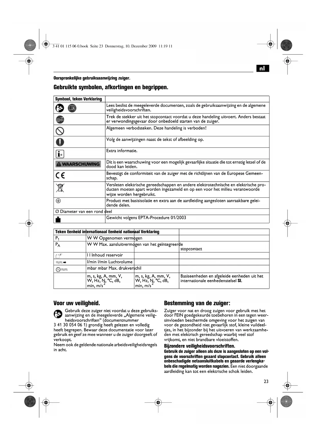 Oorspronkelijke gebruiksaanwijzing zuiger. Gebruikte symbolen, afkortingen en begrippen. Voor uw veiligheid. Gebruik deze zuiger niet voordat u deze gebruiks- aanwijzing en de meegeleverde „Algemene veilig- heidsvoorschriften” (documentnummer 3 41 30 054 06 1) grondig heeft gelezen en volledig heeft begrepen. Bewaar deze documentatie voor later gebruik en geef ze mee wanneer u de zuiger doorgeeft of verkoopt. Neem ook de geldende nationale arbeidsveiligheidsregels in acht. Bestemming van de zuiger: Zuiger voor nat en droog zuigen voor gebruik met het door FEIN goedgekeurde toebehoren in een tegen weer- sinvloeden beschermde omgeving voor het zuigen van voor de gezondheid niet gevaarlijk stof, kleine vuildeel- tjes, in het bijzonder bij het uitvoeren van werkzaamhe- den met elektrisch gereedschap waarbij veel stof vrijkomt, en niet brandbare vloeistoffen. Bijzondere veiligheidsvoorschriften. Gebruik de zuiger alleen als deze is aangesloten op een vol- gens de voorschriften geaard stopcontact. Gebruik alleen onbeschadigde netaansluitkabels en geaarde verlengka- bels die regelmatig worden nagezien. Een niet doorgaande aardleiding kan tot een elektrische schok leiden. Symbool, teken Verklaring Lees beslist de meegeleverde documenten, zoals de gebruiksaanwijzing en de algemene veiligheidsvoorschriften. Trek de stekker uit het stopcontact voordat u deze handeling uitvoert. Anders bestaat er verwondingsgevaar door onbedoeld starten van de zuiger. Algemeen verbodsteken. Deze handeling is verboden! Volg de aanwijzingen naast de tekst of afbeelding op. Extra informatie. Dit is een waarschuwing voor een mogelijk gevaarlijke situatie die tot ernstig letsel of de dood kan leiden. Bevestigt de conformiteit van de zuiger met de richtlijnen van de Europese Gemeen- schap. Versleten elektrische gereedschappen en andere elektrotechnische en elektrische pro- ducten moeten apart worden ingezameld en op een voor het milieu verantwoorde wijze worden hergebruikt. Product met basisisolatie en extra aan de aardleiding aangesloten aanraakbare gelei- dende delen. Ø Diameter van een rond deel Gewicht volgens EPTA-Procedure 01/2003 Teken Eenheid internationaal Eenheid nationaal Verklaring