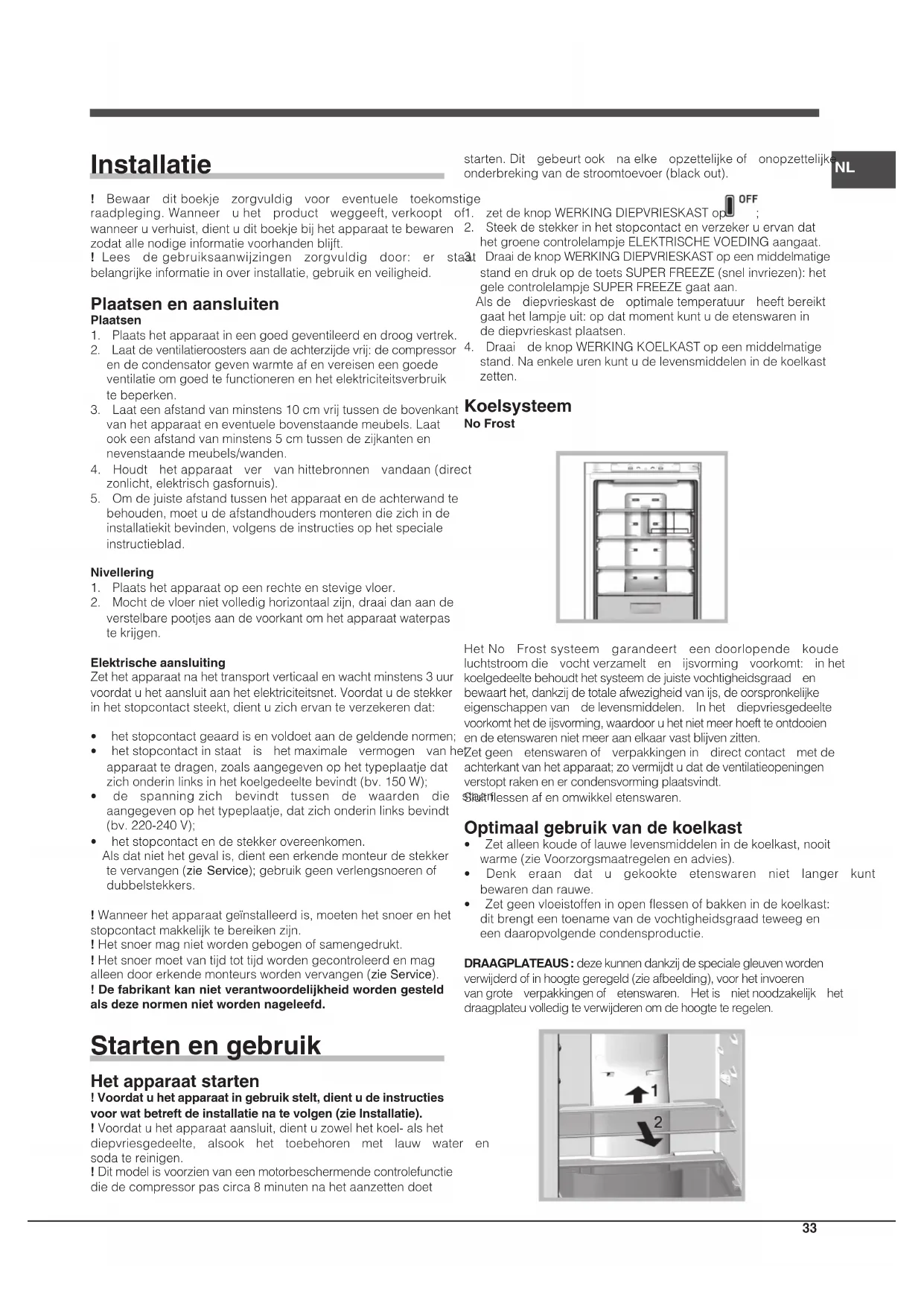 DitapparaatvoldoetaandevolgendeEURichtlijnen:-73/23/EEGvan19/02/73(Laagspanning)endaaropvolgendewijzigingen;-89/336/EEGvan03/05/89(ElektromagnetischeCompatibiliteit)endaaropvolgendewijzigingen;-2002/96/CE. Algemene veiligheid • Ditapparaat is vervaardigd voor niet-professioneel gebruikbinnenshuis.• Hetapparaatdienttewordengebruiktvoorhetbewarenenhetinvriezenvanlevensmiddelen.Hetdientuitsluitenddoorvolwassenentewordenbediend,volgensdeaanwijzingendieaangegevenzijninditinstructieboekje.• Hetapparaatdientnietbuitenshuistewordengeplaatst,ooknietinoverdektetoestand.Het is erg gevaarlijk als het inaanrakingkomtmetregenofalshetonweert.• Raakhet apparaat niet blootsvoets of metnatte handen ofvoetenaan.• Raaknooitdekoelelementenaandebinnenkantaan:uzouzichkunnenverbrandenofverwonden.• Haaldestekkernooituithetstopcontactdooraanhetsnoertetrekken.• Maakdekoelkastnietschoonofvoergeenonderhouduitalsdestekkernoginhetstopcontactzit. Het is niet voldoende langer dan twee seconden de toetsOFFopdedisplayingedrukttehoudenomelkeelektrischeverbindingteverbreken.• Alshetapparaatdefectis,magunooitaanhetinternesysteemsleutelenomeenreparatieuittevoeren.• Gebruikindevakkenwaaringevrorenlevensmiddelenwordenbewaardgeenscherpeofpuntigevoorwerpenofelektrischeapparatendienietdoordefabrikantwordenaanbevolen.• Plaatsnooitijsblokjesdienetuitdediepvrieskastkomeninuwmond.• Ditapparaatisniet geschikt voor gebruik door personen(inclusief kinderen) met fysieke, sensorische of mentalebeperkingen,ofdiegeenervaringofkennishebben,tenzijzedooreenpersoondieverantwoordelijkisvoorhunveiligheidbegeleidwordenbijofgeïnstrueerdzijnoverhetgebruikvanhetapparaat.Kinderenmoetengecontroleerdwordenomtezorgendatzenietmethetapparaatspelen.• Hetverpakkingsmateriaalisgeenspeelgoedvoorkinderen. Afvalverwijdering • Verwijderingvan het verpakkingsmateriaal: houdt u aandeplaatselijke normen, zodat het verpakkingsmateriaalhergebruiktkanworden.• DeEuropese Richtlijn 2002/96/EC over Vernietiging vanElectrische en Electronische Apparatuur (WEEE), vereistdatoude huishoudelijke electrische apparaten niet mogenvernietigdviadenormaleongesorteerdeafvalstroom.Oudeapparaten moeten apart worden ingezameld om zo hethergebruikvandegebruiktematerialenteoptimaliserenendenegatieveinvloedopdegezondheidenhetmilieutereduceren.Hetsymboolophetproductvande“afvalcontainermeteenkruiserdoor”herinnert u aan uw verplichting, dat wanneeruhetapparaat vernietigt, het apparaat apart moet wordeningezameld. Consumentenmoetencontact opnemen met de localeautoriteitenvoorinformatieoverdejuistewijzevanvernietigingvanhunoudeapparaat. Het milieu sparen en respecteren • Plaatshetapparaatineenkoele,goedgeventileerderuimte,behoedthetvoordirectezonnestralen,plaatshetnietdichtbijeenwarmtebron.• Laatdedeur,wanneeruetenswarenindekoel-ofdiepvrieskastzetoferuithaalt,zokortmogelijkopenstaan. Elke keer dat de deur opengaat ontstaat een aanzienlijkenergieverlies.• Vulhetapparaatnietmetteveeletenswaren:vooreenoptimaleconservering moet de koude luchtstroom vrijuit kunnencirculeren.Alsudecirculatiebelemmert,zaldecompressorconstantblijvenwerken. *Dezekunnenvariërenvoorwatbetreftaantalofpositie,alleen openkelemodellenaanwezig.36