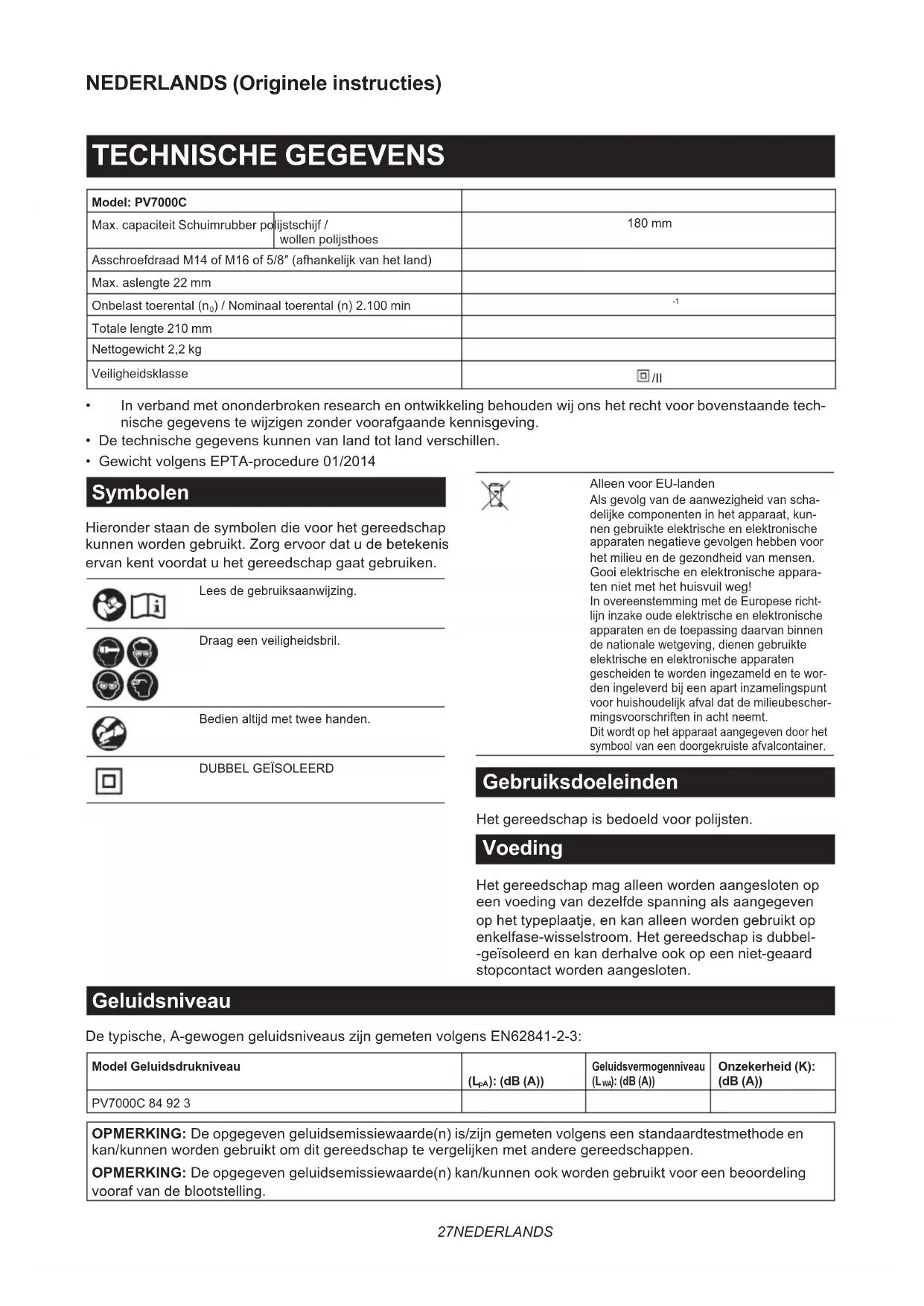) PV7000C 2,5 m/s 2 of lager 1,5 OPMERKING: De totale trillingswaarde(n) is/zijn gemeten volgens een standaardtestmethode en kan/kunnen