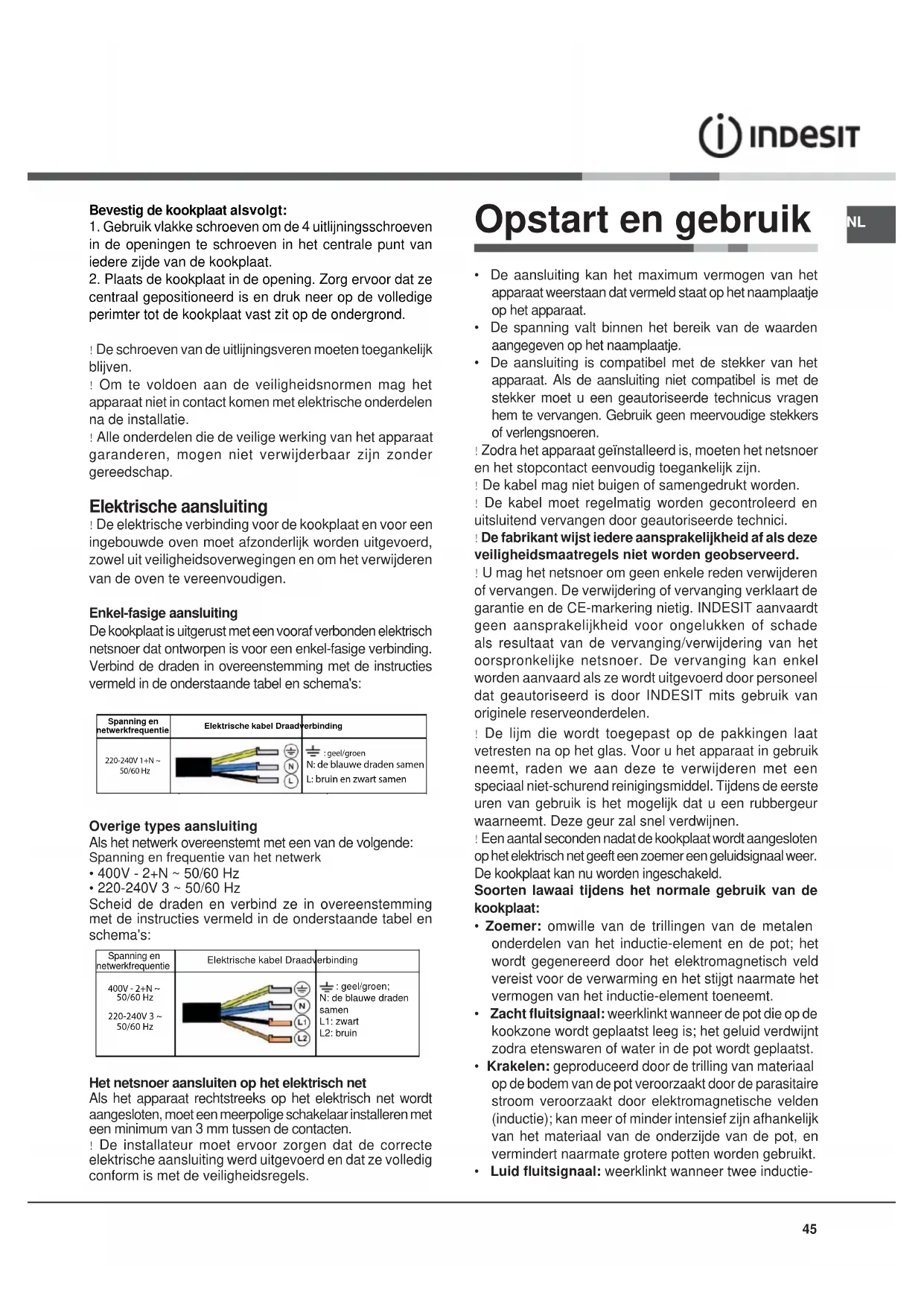 ! Vermijd het gebruik van schuurmiddelen of bijtende middelen, zoals sprays voor barbecues en ovens, vlekkenmiddelen, roestverwijderende producten, schoonmaakmiddelen in poedervorm of schuursponzen: deze kunnen het oppervlak onherstelbaar krassen. ! Gebruik nooit stoom- of hogedrukreinigers voor het reinigen van het apparaat.• Voor normaal onderhoud moet u de kookplaat met een vochtige spons reinigen en afdrogen met keukenpapier.• Als de plaat erg vuil is moet hij worden schoongemaakt met een speciaal middel voor keramiekplaten. Daarna moet u hem afspoelen en afdrogen.• Voor het verwijderen van hardnekkig vuil kunt u een hiervoor bestemd schrapertje gebruiken. Doe dit zo snel mogelijk voordat het apparaat afkoelt, zodat de etensresten niet aankoeken. Uitstekende resultaten bereikt u ook met een speciaal voor keramiekplaten vervaardigd roestvrij staal sponsje dat u in een sopje doopt.• Als er op de kookplaat onverhoopt voorwerpen of plastic materiaal of suiker zouden smelten, moet u ze onmiddellijk met het schrapertje verwijderen zolang het oppervlak nog warm is.• Als de plaat is schoongemaakt, kan hij worden behandeld met een speciaal product voor onderhoud en bescherming: het onzichtbare laagje dat dit product achterlaat beschermt de plaat in het geval er iets overkookt. Dit soort handelingen moeten worden uitgevoerd als de plaat lauw of koud is.• Vergeet niet de kookplaat altijd met schoon water af te spoelen en goed af te drogen: restjes schoonmaakmiddel kunnen de volgende keer dat u kookt aankoeken.Raamwerk van roestvrij staal(alleen bij modellen met lijst)Roestvrij staal kan vlekken gaan vertonen als er voor langere tijd kalkhoudend water op blijft liggen of als gevolg van gebruik van schoonmaakmiddelen die fosfor bevatten.Spoel en droog de kookplaat altijd goed af nadat u hem heeft schoongemaakt. Droog gemorst water altijd meteen goed af. ! Enkele kookplaten hebben een lijst van aluminium die lijkt op roestvrij staal. Gebruik voor het reinigen en ontvetten geen producten die niet geschikt zijn voor aluminium. De kookplaat verwijderen Als u de kookplaat uit elkaar moet halen:1. verwijder de schroeven die de centreringsklemmen aan de zijkant vasthouden;2. maak de schroeven van de bevestigingshaken op de hoeken los; 3. haal de kookplaat uit het meubel. ! U mag nooit aan het interne systeem sleutelen om een reparatie proberen uit te voeren. Als er een storing is moet u contact opnemen met de Service Dienst. Technische beschrijving van de modellen Het inductiesysteem is het snelste kooksysteem dat er bestaat. In tegenstelling tot de traditionele kookplaten wordt niet het kookgedeelte verwarmd: de warmte wordt direct binnenin de pan gecreëerd, die daarom noodzakelijkerwijs een bodem van ferromagnetisch materiaal moet bezitten.KookplatenKookgedeeltesLinksachterRechtsachterLinksvoorRechtsvoorTotaal vermogenVermogen (in W) Vermogen (in W)I 1200 - B1600I 1500 - B 2000I 1500 - B 2000I 1200 - B1600 VIX 644 C E