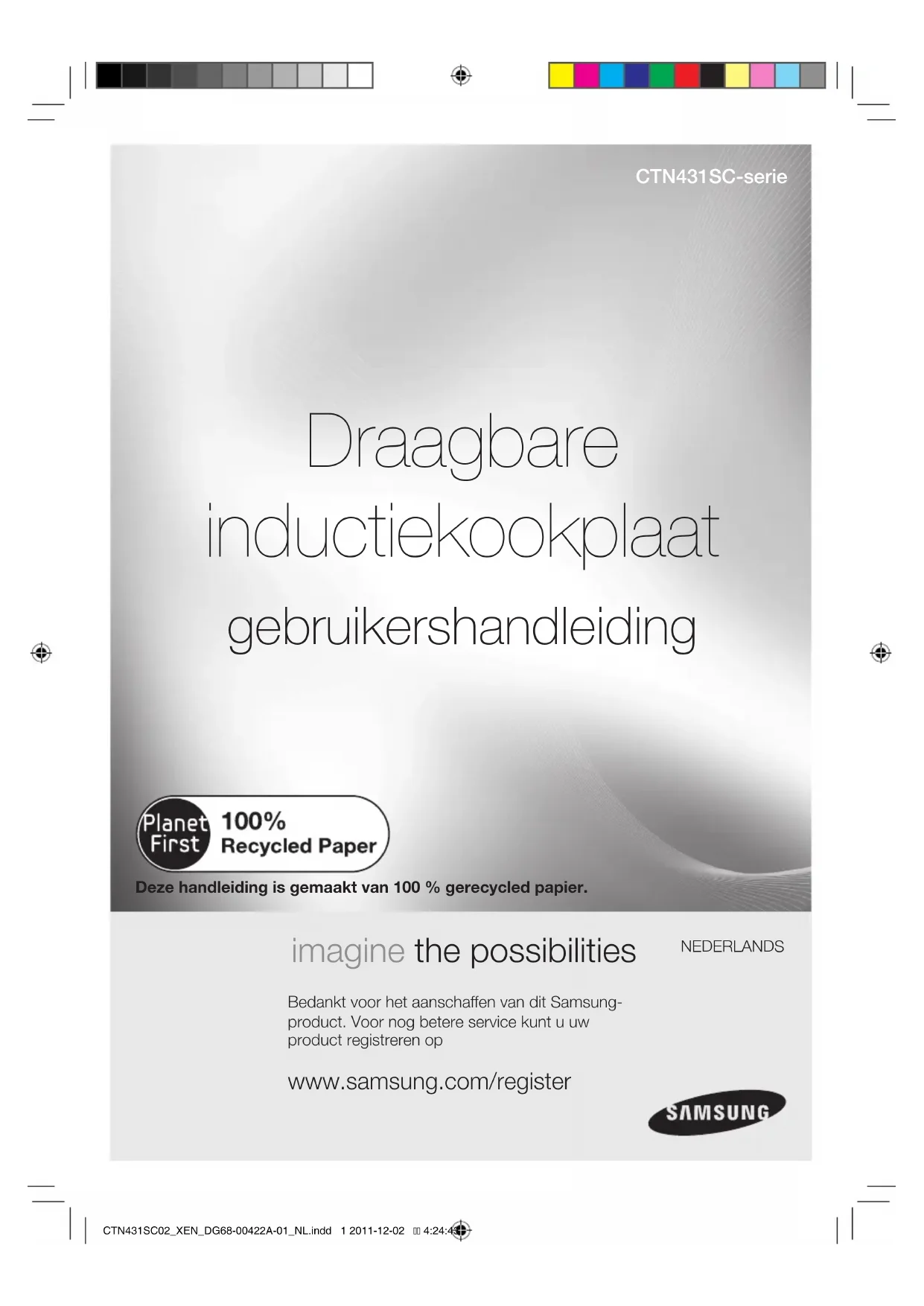 imagine the possibilities Bedankt voor het aanschaen van dit Samsung-product. Voor nog betere service kunt u uw product registreren op www.samsung.com/register Draagbare inductiekookplaat gebruikershandleiding CTN431SC-serie NEDERLANDS Deze handleiding is gemaakt van 100 % gerecycled papier.CTN431SC02_XEN_DG68-00422A-01_NL.indd 1 2011-12-02 4:24:432_ over deze gebruiksaanwijzing over deze gebruiksaanwijzing Neemt u even rustig de tijd om deze gebruiksaanwijzing door te lezen alvorens u het apparaat aansluit en let daarbij in het bijzonder op de veiligheidsinformatie in de volgende paragraaf. Bewaar deze gebruiksaanwijzing zodat u er ook in de toekomst gebruik van kunt maken. Wanneer u het apparaat verkoopt of overdraagt, dient u de gebruiksaanwijzing bij te voegen. BelaNgrijke veiligheidSSymBoleN eN voorzorgSmaaTregeleN. De volgende symbolen komen in de tekst van deze gebruiksaanwijzing voor: WAARSCHUWING Gevaar of onveilige handelingen die kunnen leiden tot ernstig persoonlijk letsel of de dood. LET OP Gevaar of onveilige handelingen die kunnen leiden tot licht persoonlijk letsel of schade. LET OP Om de kans op brand, explosies, elektrische schokken of persoonlijk letsel bij het gebruik van uw kookplaat te verminderen, dient u deze veiligheidsvoorschriften te volgen. NIET proberen. NIET demonteren. NIET aanraken. Volg de aanwijzingen nauwkeurig op. Trek de stekker uit het stopcontact. Om elektrische schokken te voorkomen, moet het apparaat zijn geaard. Neem contact op met het servicecentrum. Opmerking Belangrijk CTN431SC02_XEN_DG68-00422A-01_NL.indd 2 2011-12-02 4:24:44veiligheidsinstructies _3 veiligheidSiNSTruCTieS veiligheidsinstructies De veiligheidsvoorzieningen van dit apparaat voldoen aan alle technische normen en veiligheidsnormen op dit gebied. Als producent van dit product zijn wij echter van mening dat het van belang is dat u de volgende veiligheidsinstructies grondig doorneemt. elekTriSChe veiligheid Het apparaat mag alleen worden onderhouden door onderhoudspersoneel dat hiervoor gekwalificeerd is. Reparaties die worden uitgevoerd door niet-gekwalificeerde personen kunnen tot ernstig letsel of storingen leiden. Als uw apparaat moet worden gerepareerd, neemt u hiervoor contact op met uw plaatselijke servicecentrum. Het niet opvolgen van deze instructies kan leiden tot schade en het vervallen van uw garantie.Wanneer het apparaat een storing vertoont, breekt, scheurt of er in barsten ontstaan:- kookzone uitschakelen.- de kookplaat van de stroomvoorziening afsluiten; en- contact opnemen met uw plaatselijke servicecentrum. veiligheid voor kiNdereN Dit apparaat is niet geschikt voor gebruik door jonge kinderen of geestelijk gehandicapten zonder toezicht door een volwassene.Jonge kinderen mogen het apparaat uitsluitend onder toezicht gebruiken om te voorkomen dat ze ermee gaan spelen.De kookzone wordt warm wanneer u kookt. Houd kleine kinderen altijd uit de buurt van het apparaat. veiligheid TijdeNS heT geBruik Dit apparaat mag alleen worden gebruikt voor de normale bereiding van voedsel in een huishouden. Het is niet geschikt voor commercieel of industrieel gebruik.Gebruik de kookplaat nooit om een ruimte te verwarmen.Let op wanneer u elektrische apparaten aansluit op een stopcontact in de buurt van de kookplaat. Snoeren mogen nooit in aanraking met de kookplaat komen.Oververhitte vetten en olie kunnen snel ontvlammen. Blijf altijd bij het apparaat wanneer u voedsel bereidt in vetten of olie, bijvoorbeeld wanneer u friet bakt.Schakel de kookzone na gebruik uit.Houd de bedieningszones schoon en droog.Plaats nooit ontbrandbare zaken op de kookplaat i.v.m. brandgevaar.Gebruik de kookplaat nooit om aluminiumfolie, producten die in aluminiumfolie zijn gewikkeld of bevroren levensmiddelen in een aluminium verpakking te verhitten.Onzorgvuldig gebruik van het apparaat kan tot brandwonden leiden.Snoeren van elektrische apparaten mogen nooit in aanraking komen met het hete oppervlak van de kookplaat of hete pannen.Gebruik de kookplaat niet om kleding te drogen.WAARSCHUWINGWAARSCHUWINGWAARSCHUWINGCTN431SC02_XEN_DG68-00422A-01_NL.indd 3 2011-12-02 4:24:444_ veiligheidsinstructies Het heten glazen oppervlak niet aanraken. U zou zich kunnen branden. Bewaar nooit brandbare materialen zoals spuitbussen en reinigingsmiddelen in laden of kasten onder de kookplaat. WAARSCHUWING: Gebruikers met een pacemaker of een actief hartimplantaat moeten met hun bovenlichaam ten minste 30 cm afstand tot de ingeschakelde inductiekookzone bewaren. Raadpleeg bij twijfel de fabrikant van het apparaat of een arts. veiligheid TijdeNS de reiNigiNg Schakel de apparatuur altijd uit alvorens u deze gaat reinigen. Om veiligheidsredenen mag het apparaat niet worden gereinigd met stoom- of hogedrukreinigers. Volg bij het reinigen van de kookplaat de aanwijzingen in deze gebruiksaanwijzing. SymBoleN voor erNSTige waarSChuwiNgeN Bij de iNSTallaTie Stop de stekker in een geschikt stopcontact en gebruik deze contactdoos alleen voor dit apparaat. Steek de stekker stevig in het stopcontact. Gebruik bovendien nooit een verlengsnoer. - Wanneer u zich niet aan deze instructies houdt en een wandcontactdoos met andere apparaten deelt via een verlengsnoer (met of zonder verdeeldoos), kan dit tot elektrische schokken en brand leiden. - Gebruik geen transformator. Dit kan leiden tot elektrische schokken of brand. Het apparaat moet na de installatie kunnen worden afgesloten van de stroomvoorziening. U kunt het apparaat afsluiten door de stekker toegankelijk te laten of door een schakelaar in de bedrading in te bouwen overeenkomstig de richtlijnen voor bedrading. Installeer het apparaat niet in de buurt van een verwarming of ontvlambaar materiaal. Installeer het apparaat niet op een vochtige, olieachtige of stoge plaats of op een plaats die blootstaat aan direct zonlicht of water (regendruppels). Installeer het apparaat niet op een plaats waar er gas kan lekken. - Dit kan leiden tot elektrische schokken of brand. Het apparaat is niet bedoe