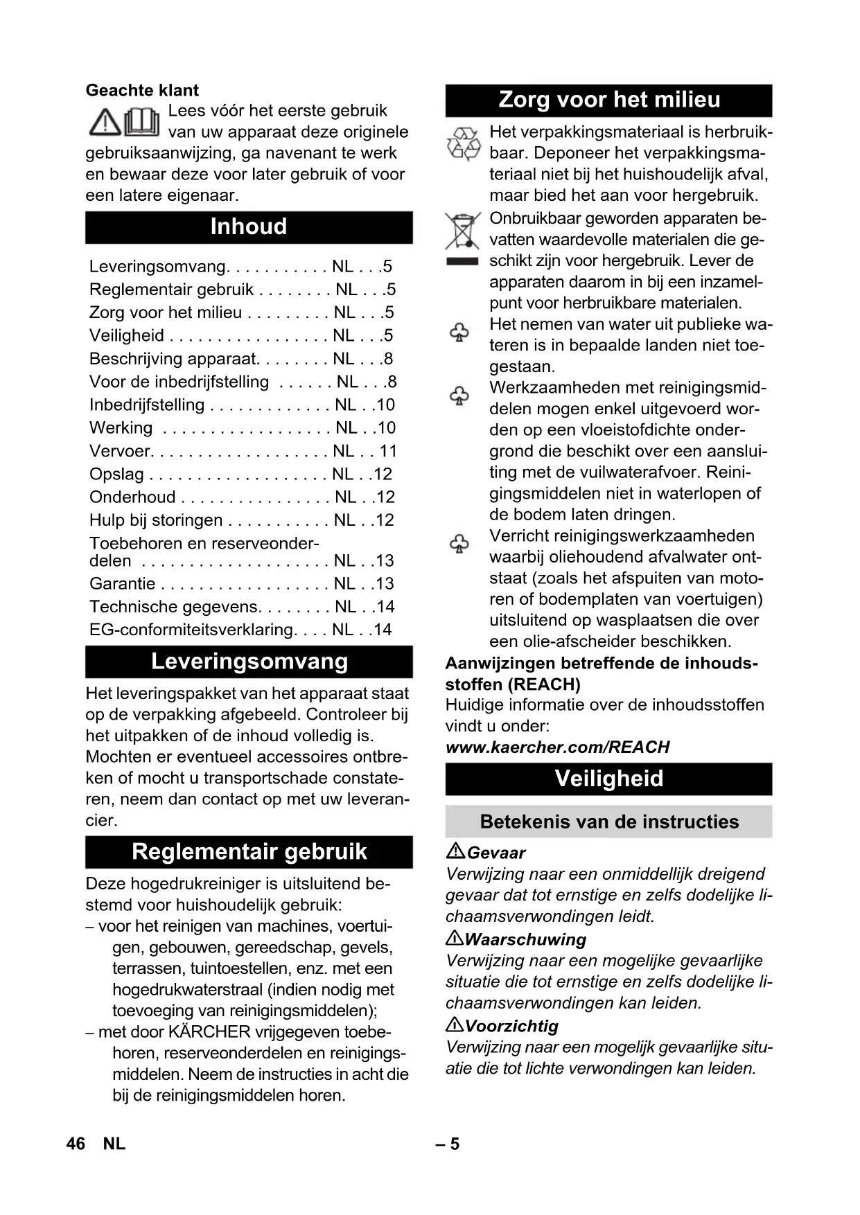 Prodotto: Idropulitrice Modelo: 1.180-xxx Direttive CE pertinenti 2000/14/CE 2004/108/CE 2006/42/CE (+2009/127/CE) 2011/65/UE Norme armonizzate applicate EN 50581 EN 55014–1: 2006+A1: 2009+A2: 2011 EN 55014–2: 1997+A1: 2001+A2: 2008 EN 60335–1 EN 60335–2–79 EN 61000–3–2: 2006+A1: 2009+A2: 2009 EN 61000–3–3: 2008 EN 62233: 2008 Procedura di valutazione della confor- mità applicata 2000/14/CE: Allegato V Livello di potenza sonora dB(A) Misurato: 89 Garantito: 92 Winnenden, 2013/09/01 CEO Head of Approbation 45IT– 5 Geachte klant Lees vóór het eerste gebruik van uw apparaat deze originele gebruiksaanwijzing, ga navenant te werk en bewaar deze voor later gebruik of voor een latere eigenaar. Het leveringspakket van het apparaat staat op de verpakking afgebeeld. Controleer bij het uitpakken of de inhoud volledig is. Mochten er eventueel accessoires ontbre- ken of mocht u transportschade constate- ren, neem dan contact op met uw leveran- cier. Deze hogedrukreiniger is uitsluitend be- stemd voor huishoudelijk gebruik: – voor het reinigen van machines, voertui- gen, gebouwen, gereedschap, gevels, terrassen, tuintoestellen, enz. met een hogedrukwaterstraal (indien nodig met toevoeging van reinigingsmiddelen); – met door KÄRCHER vrijgegeven toebe- horen, reserveonderdelen en reinigings- middelen. Neem de instructies in acht die bij de reinigingsmiddelen horen. Het verpakkingsmateriaal is herbruik- baar. Deponeer het verpakkingsma- teriaal niet bij het huishoudelijk afval, maar bied het aan voor hergebruik. Onbruikbaar geworden apparaten be- vatten waardevolle materialen die ge- schikt zijn voor hergebruik. Lever de apparaten daarom in bij een inzamel- punt voor herbruikbare materialen. Het nemen van water uit publieke wa- teren is in bepaalde landen niet toe- gestaan. Werkzaamheden met reinigingsmid- delen mogen enkel uitgevoerd wor- den op een vloeistofdichte onder- grond die beschikt over een aanslui- ting met de vuilwaterafvoer. Reini- gingsmiddelen niet in waterlopen of de bodem laten dringen. Verricht reinigingswerkzaamheden waarbij oliehoudend afvalwater ont- staat (zoals het afspuiten van moto- ren of bodemplaten van voertuigen) uitsluitend op wasplaatsen die over een olie-afscheider beschikken. Aanwijzingen betreffende de inhouds- stoffen (REACH) Huidige informatie over de inhoudsstoffen vindt u onder: www.kaercher.com/REACH Gevaar Verwijzing naar een onmiddellijk dreigend gevaar dat tot ernstige en zelfs dodelijke li- chaamsverwondingen leidt. 몇 Waarschuwing Verwijzing naar een mogelijke gevaarlijke situatie die tot ernstige en zelfs dodelijke li- chaamsverwondingen kan leiden. 몇 Voorzichtig Verwijzing naar een mogelijk gevaarlijke situ- atie die tot lichte verwondingen kan leiden. Inhoud Leveringsomvang. . . . . . . . . . . NL . . .5 Reglementair gebruik . . . . . . . . NL . . .5 Zorg voor het milieu . . . . . . . . . NL . . .5 Veiligheid . . . . . . . . . . . . . . . . . NL . . .5 Beschrijving apparaat. . . . . . . . NL . . .8 Voor de inbedrijfstelling . . . . . . NL . . .8 Inbedrijfstelling . . . . . . . . . . . . . NL . .10 Werking . . . . . . . . . . . . . . . . . . NL . .10 Vervoer. . . . . . . . . . . . . . . . . . . NL . . 11 Opslag . . . . . . . . . . . . . . . . . . . NL . .12 Onderhoud . . . . . . . . . . . . . . . . NL . .12 Hulp bij storingen . . . . . . . . . . . NL . .12 Toebehoren en reserveonder- delen . . . . . . . . . . . . . . . . . . . . NL . .13 Garantie . . . . . . . . . . . . . . . . . . NL . .13 Technische gegevens. . . . . . . . NL . .14 EG-conformiteitsverklaring. . . . NL . .14 Leveringsomvang Reglementair gebruik Zorg voor het milieu Veiligheid Betekenis van de instructies 46 NL– 6 Opgelet Verwijzing naar een mogelijke gevaarlijke situatie die tot materiële schade kan leiden. De hogedrukstraal mag niet gericht worden op personen, dieren, actieve elektrische uit- rusting of het apparaat zelf. Apparaat tegen vorst beschermen. Het apparaat mag niet onmiddellijk aangesloten worden op het open- bare drinkwaternet. Gevaar Neem de netstekker en de contactdoos nooit met vochtige handen vast. Controleer de stroomaansluitleidingen met netstekker voor elk gebruik op schade. Laat beschadigde stroomaan- sluitleidingen onmiddellijk door een ge- autoriseerde klantenservice / electri- cien vervangen. Neem een apparaat met beschadigde stroomaansluitleiding niet in bedrijf. Alle stroomvoerende voorwerpen bin- nen het werkgebied moeten spuitwater- dicht zijn. Netstekker en koppeling van een ver- lengkabel moeten waterdicht zijn en mogen niet in water liggen. De koppe- ling mag verder niet op de grond liggen. Er wordt aanbevolen om kabeltrommels te gebruiken die garanderen dat de contactdozen zich minstens 60 mm bo- ven de grond bevinden. Let erop dat stroomleidingen en ver- lengkabels niet aangetast of bescha- digd worden door overrijden, knellen, rekken o.d. Bescherm de stroomleidin- gen tegen hitte, olie en scherpe randen. 몇 Waarschuwing Sluit het apparaat enkel aan wissel- stroom aan. De spanning moet over- eenstemmen met het typeplaatje van het apparaat. Het apparaat mag enkel aan een elek- trische aansluiting aangesloten zijn die door een elektromonteur conform IEC 60364 werd uitgevoerd. Niet-geschikte elektrische verlengka- bels kunnen gevaarlijk zijn. Gebruik in open lucht enkel daartoe vrijgegeven en overeenkomstig gekenmerkte elek- trische verlengkabels met een voldoen- de grote diameter: 1 – 10 m: 1,5 mm