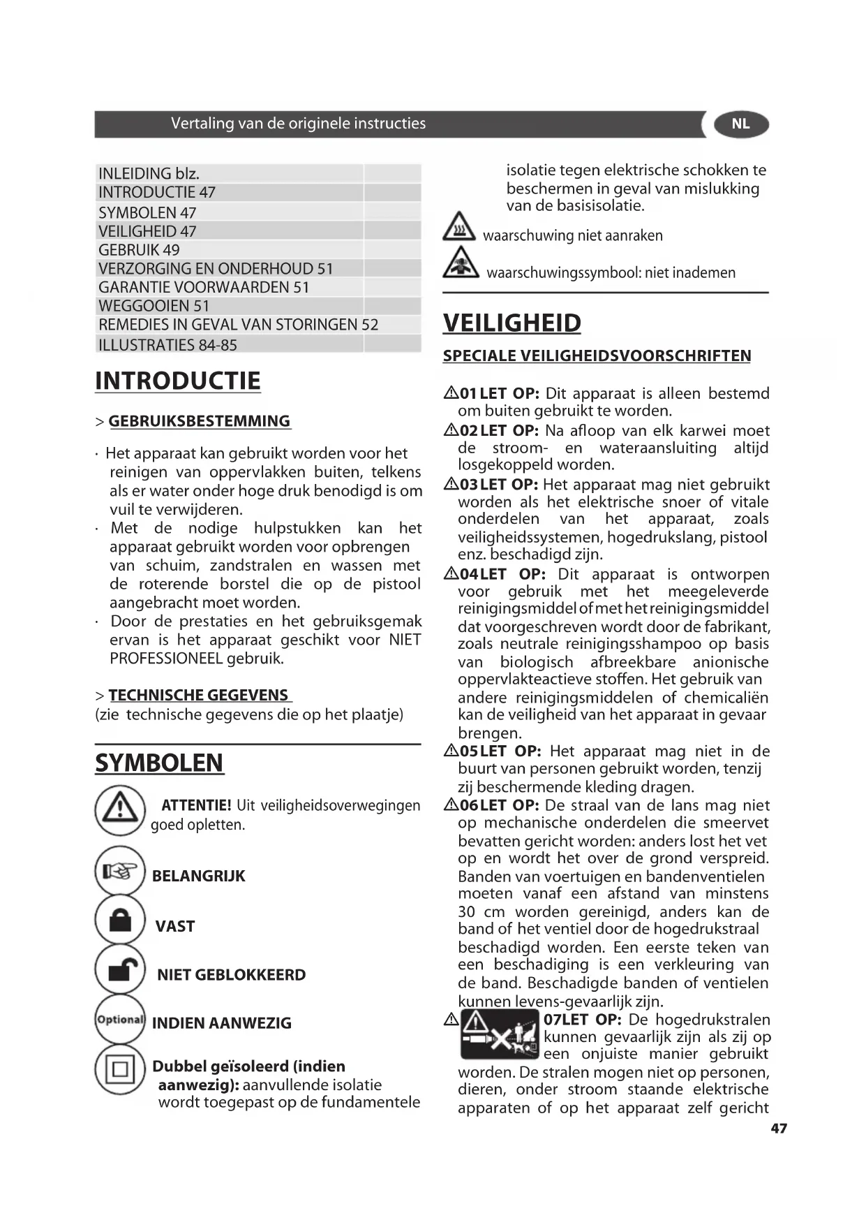 - 03 LET OP: Het apparaat mag niet gebruikt worden als het elektrische snoer of vitale onderdelen van het apparaat, zoals veiligheidssystemen, hogedrukslang, pistool enz. beschadigd zijn.