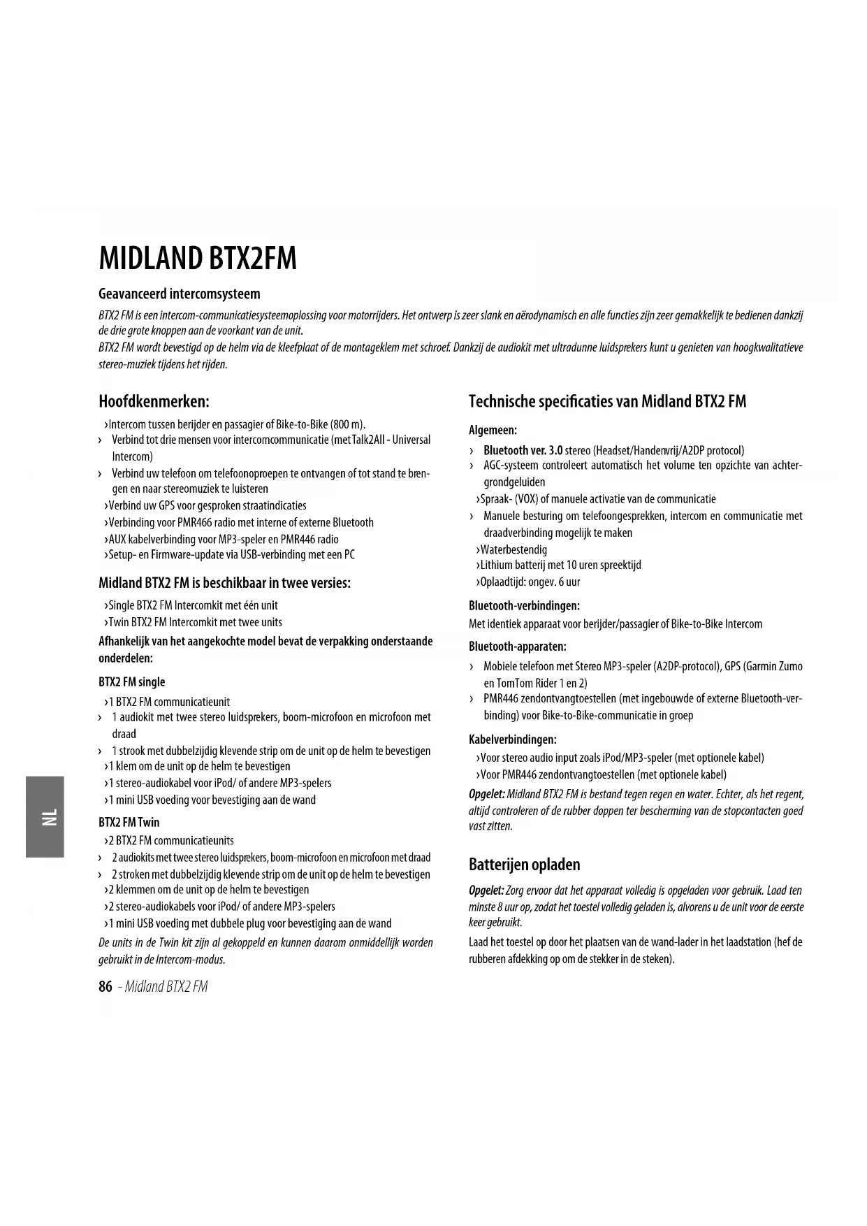 › AGC-systeem controleert automatisch het volume ten opzichte van achter- grondgeluiden › Spraak- (VOX) of manuele activatie van de communicatie › Manuele besturing om telefoongesprekken, intercom en communicatie met draadverbinding mogelijk te maken › Waterbestendig › Lithium batterij met 10 uren spreektijd › Oplaadtijd: ongev. 6 uurBluetooth-verbindingen:Met identiek apparaat voor berijder/passagier of Bike-to-Bike Intercom Bluetooth-apparaten: › Mobiele telefoon met Stereo MP3-speler (A2DP-protocol), GPS (Garmin Zumo en TomTom Rider 1 en 2) › PMR446 zendontvangtoestellen (met ingebouwde of externe Bluetooth-ver- binding) voor Bike-to-Bike-communicatie in groep Kabelverbindingen: › Voor stereo audio input zoals iPod/MP3-speler (met optionele kabel) › Voor PMR446 zendontvangtoestellen (met optionele kabel)Opgelet: Midland BTX2 FM is bestand tegen regen en water. Echter, als het regent, altijd controleren of de rubber doppen ter bescherming van de stopcontacten goed vast zitten. Batterijen opladen Opgelet: Zorg ervoor dat het apparaat volledig is opgeladen voor gebruik. Laad ten minste 8 uur op, zodat het toestel volledig geladen is, alvorens u de unit voor de eerste keer gebruikt. Laad het toestel op door het plaatsen van de wand-lader in het laadstation (hef de rubberen afdekking op om de stekker in de steken).Midland BTX2 FM - 87