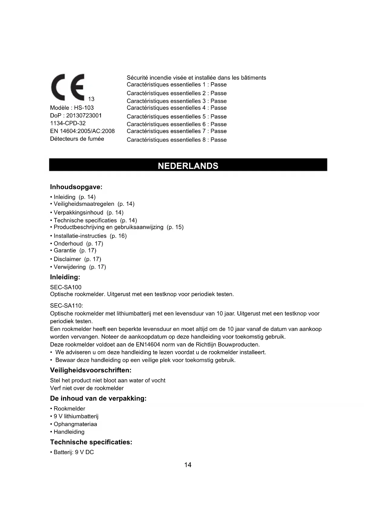 Deze rookmelder voldoet aan de EN14604 norm van de Richtlijn Bouwproducten.