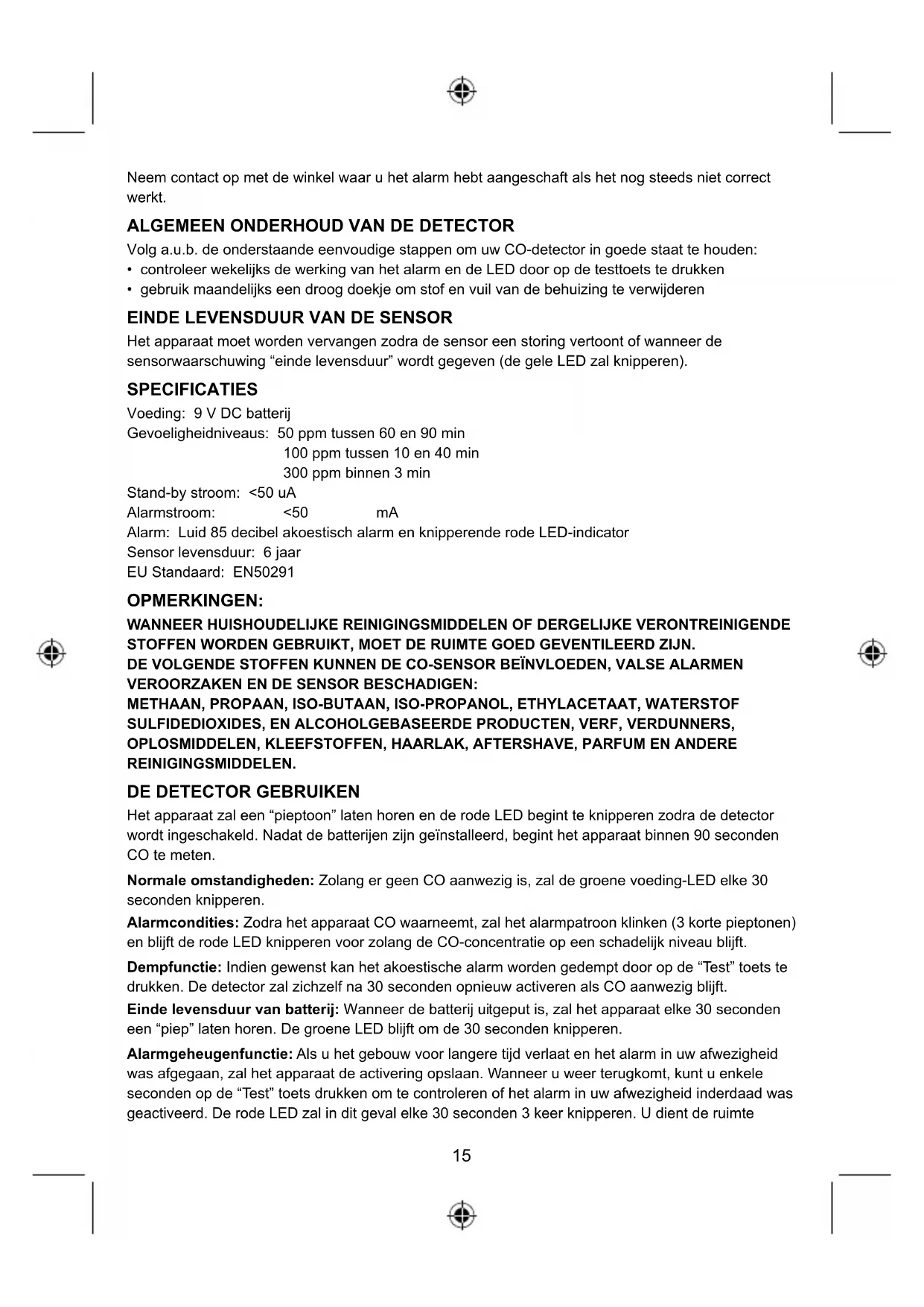 Stand-by stroom: <50 uA Alarmstroom: <50 mA Alarm: Luid 85 decibel akoestisch alarm en knipperende rode LED-indicator