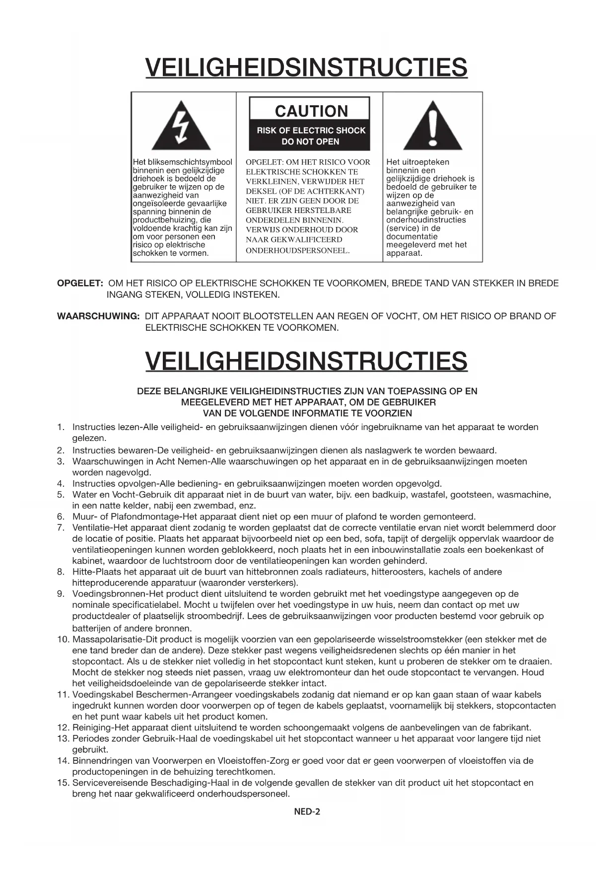 breng het naar gekwalificeerd onderhoudspersoneel. OPGELET: OM HET RISICO VOOR ELEKTRISCHE SCHOKKEN TE VERKLEINEN, VERWIJDER HET DEKSEL (OF DE ACHTERKANT) NIET. ER ZIJN GEEN DOOR DE GEBRUIKER HERSTELBARE ONDERDELEN BINNENIN. VERWIJS ONDERHOUD DOOR NAAR GEKWALIFICEERD ONDERHOUDSPERSONEEL.Het bliksemschichtsymbool binnenin een gelijkzijdige driehoek is bedoeld de gebruiker te wijzen op de aanwezigheid van ongeïsoleerde gevaarlijke spanning binnenin de productbehuizing, die voldoende krachtig kan zijn om voor personen een risico op elektrische schokken te vormen.Het uitroepteken binnenin een gelijkzijdige driehoek is bedoeld de gebruiker te wijzen op de aanwezigheid van belangrijke gebruik- en onderhoudinstructies (service) in de documentatie meegeleverd met het apparaat. CAUTION