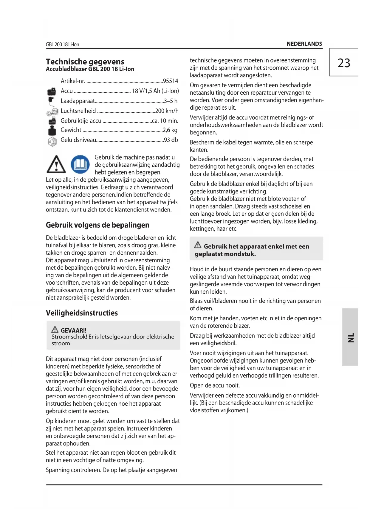 ebruik het apparaat enkel met een geplaatst mondstuk. Houd in de buurt staande personen en dieren op een veilige afstand van het tuinapparaat, omdat weg- geslingerde vreemde voorwerpen tot verwondingen kunnen leiden. Blaas vuil/bladeren nooit in de richting van personen of dieren. Kom met je handen, voeten etc. niet in de openingen van de roterende blazer. Draag bij werkzaamheden met de bladblazer altijd een veiligheidsbril. Voer nooit wijzigingen uit aan het tuinapparaat. Ongeoorloofde wijzigingen kunnen gevolgen heb- ben voor de veiligheid van uw tuinapparaat en in verhoogd geluid en verhoogde trillingen resulteren. Open de accu nooit. Verwijder een defecte accu vakkundig en onmiddel- lijk. (Bij een beschadigde accu kunnen schadelijke vloeistoen vrijkomen.) Technische gegevens Accubladblazer GBL 200 18 Li-Ion Artikel-nr. ..............................................................95514 Accu .............................................. 18 V/1,5 Ah (Li-Ion) Laadapparaat........................................................3–5 h Luchtsnelheid ...............................................200 km/h Gebruiktijd accu ........................................ca. 10 min. Gewicht .................................................................2,6 kg Geluidsniveau.......................................................93 db24 GBL 200 18 Li-Ion