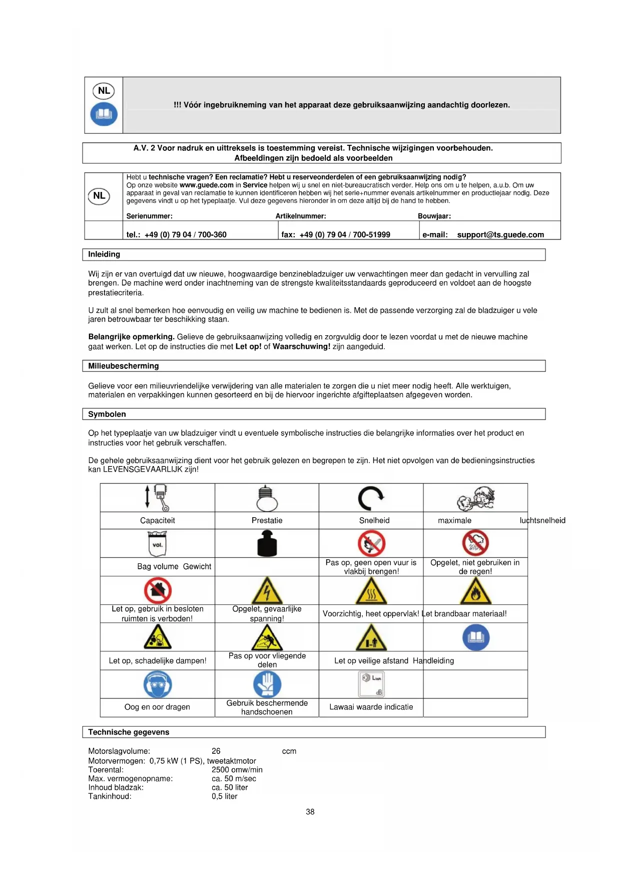 tel.: +49 (0) 79 04 / 700-360 fax: +49 (0) 79 04 / 700-51999 e-mail: support@ts.guede.com Inleiding Wij zijn er van overtuigd dat uw nieuwe, hoogwaardige benzinebladzuiger uw verwachtingen meer dan gedacht in vervulling zal brengen. De machine werd onder inachtneming van de strengste kwaliteitsstandaards geproduceerd en voldoet aan de hoogste prestatiecriteria. U zult al snel bemerken hoe eenvoudig en veilig uw machine te bedienen is. Met de passende verzorging zal de bladzuiger u vele jaren betrouwbaar ter beschikking staan. Belangrijke opmerking. Gelieve de gebruiksaanwijzing volledig en zorgvuldig door te lezen voordat u met de nieuwe machine gaat werken. Let op de instructies die met Let op! of Waarschuwing! zijn aangeduid. Milieubescherming Gelieve voor een milieuvriendelijke verwijdering van alle materialen te zorgen die u niet meer nodig heeft. Alle werktuigen, materialen en verpakkingen kunnen gesorteerd en bij de hiervoor ingerichte afgifteplaatsen afgegeven worden. Symbolen Op het typeplaatje van uw bladzuiger vindt u eventuele symbolische instructies die belangrijke informaties over het product en instructies voor het gebruik verschaffen. De gehele gebruiksaanwijzing dient voor het gebruik gelezen en begrepen te zijn. Het niet opvolgen van de bedieningsinstructies kan LEVENSGEVAARLIJK zijn!