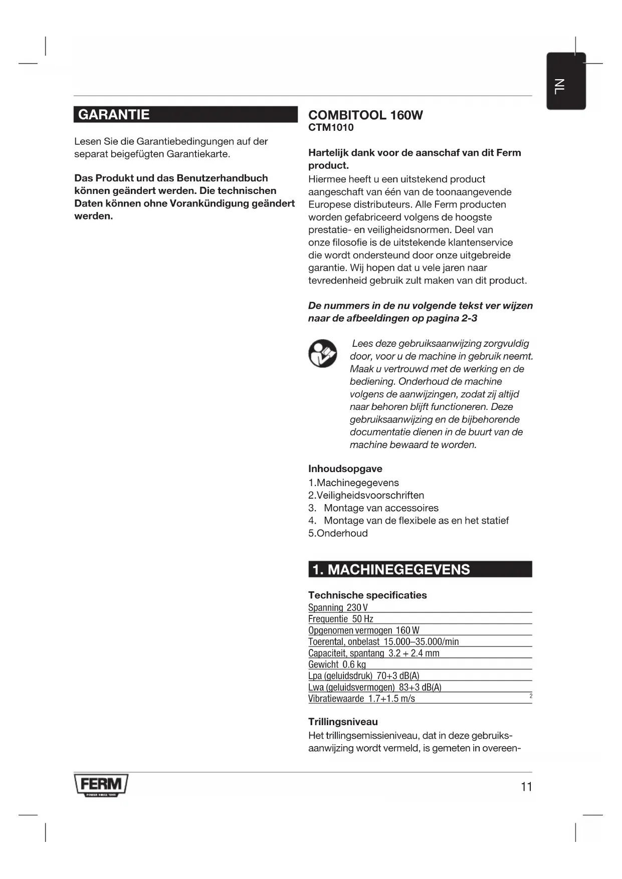 GARANTIE Lesen Sie die Garantiebedingungen auf der separat beigefügten Garantiekarte. Das Produkt und das Benutzerhandbuch können geändert werden. Die technischen Daten können ohne Vorankündigung geändert werden. COMBITOOL 160W CTM1010 Hartelijk dank voor de aanschaf van dit Ferm product. Hiermee heeft u een uitstekend product aangeschaft van één van de toonaangevende Europese distributeurs. Alle Ferm producten worden gefabriceerd volgens de hoogste prestatie- en veiligheidsnormen. Deel van onze filosofie is de uitstekende klantenservice die wordt ondersteund door onze uitgebreide garantie. Wij hopen dat u vele jaren naar tevredenheid gebruik zult maken van dit product. De nummers in de nu volgende tekst ver wijzen naar de afbeeldingen op pagina 2-3 Lees deze gebruiksaanwijzing zorgvuldig door, voor u de machine in gebruik neemt. Maak u vertrouwd met de werking en de bediening. Onderhoud de machine volgens de aanwijzingen, zodat zij altijd naar behoren blijft functioneren. Deze gebruiksaanwijzing en de bijbehorende documentatie dienen in de buurt van de machine bewaard te worden. Inhoudsopgave