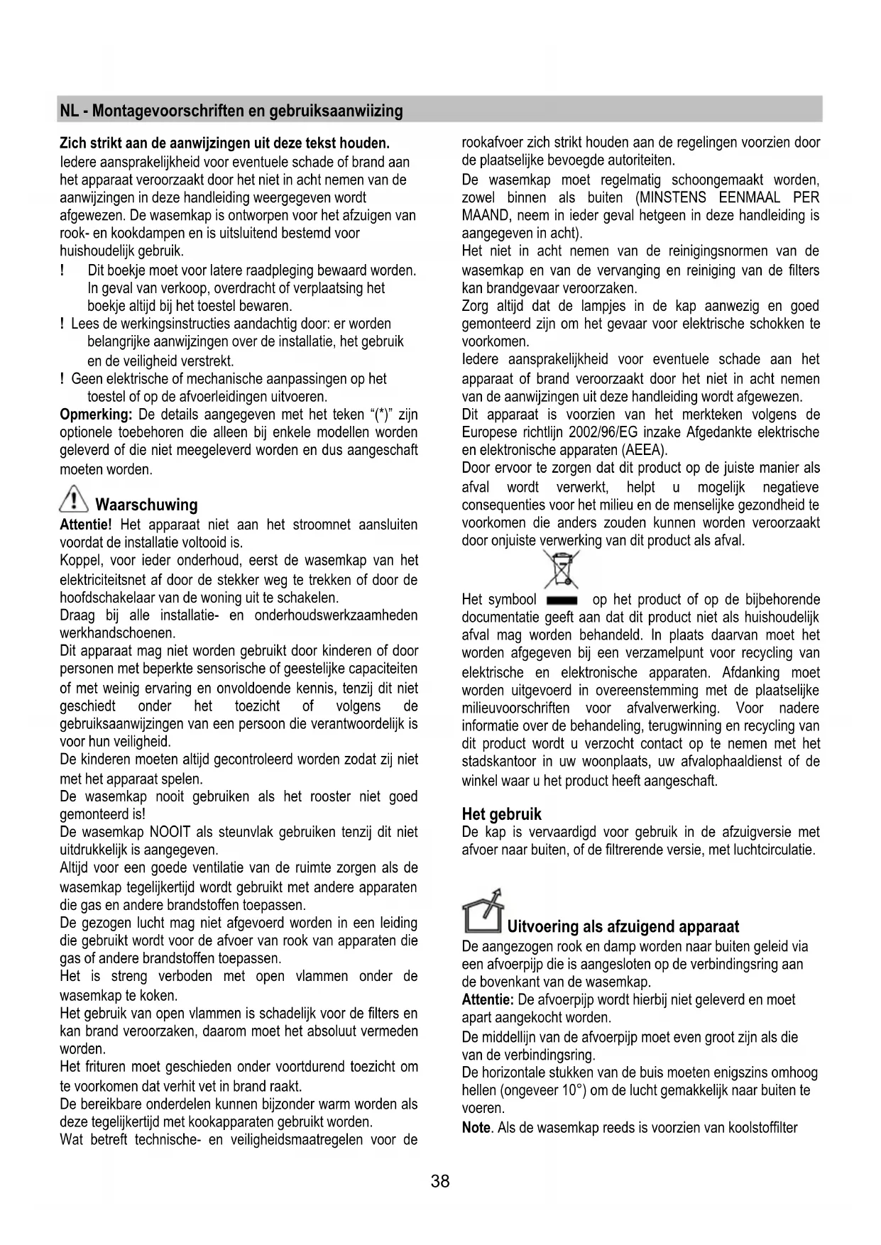 Attentie! Alvorens de wasemkap weer aan het voedingsnet