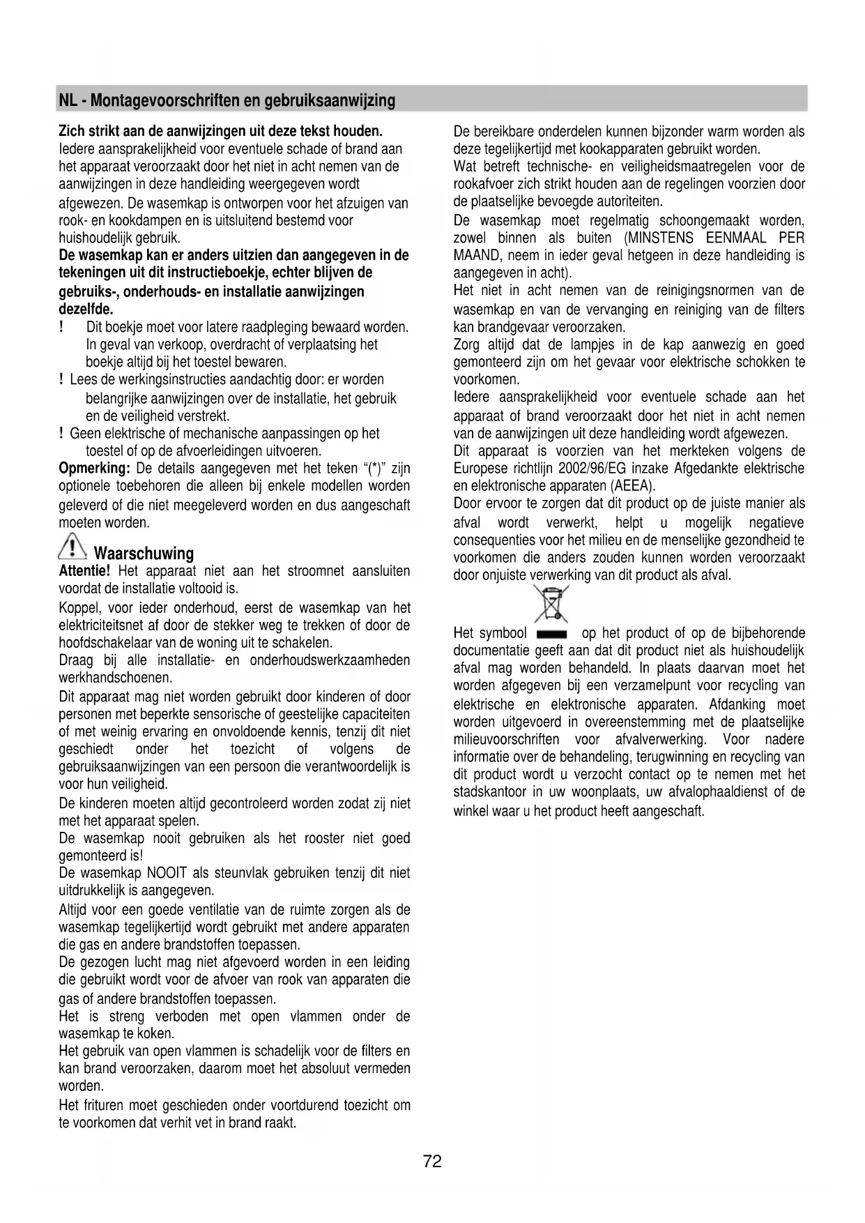 afgewezen. De wasemkap is ontworpen voor het afzuigen van