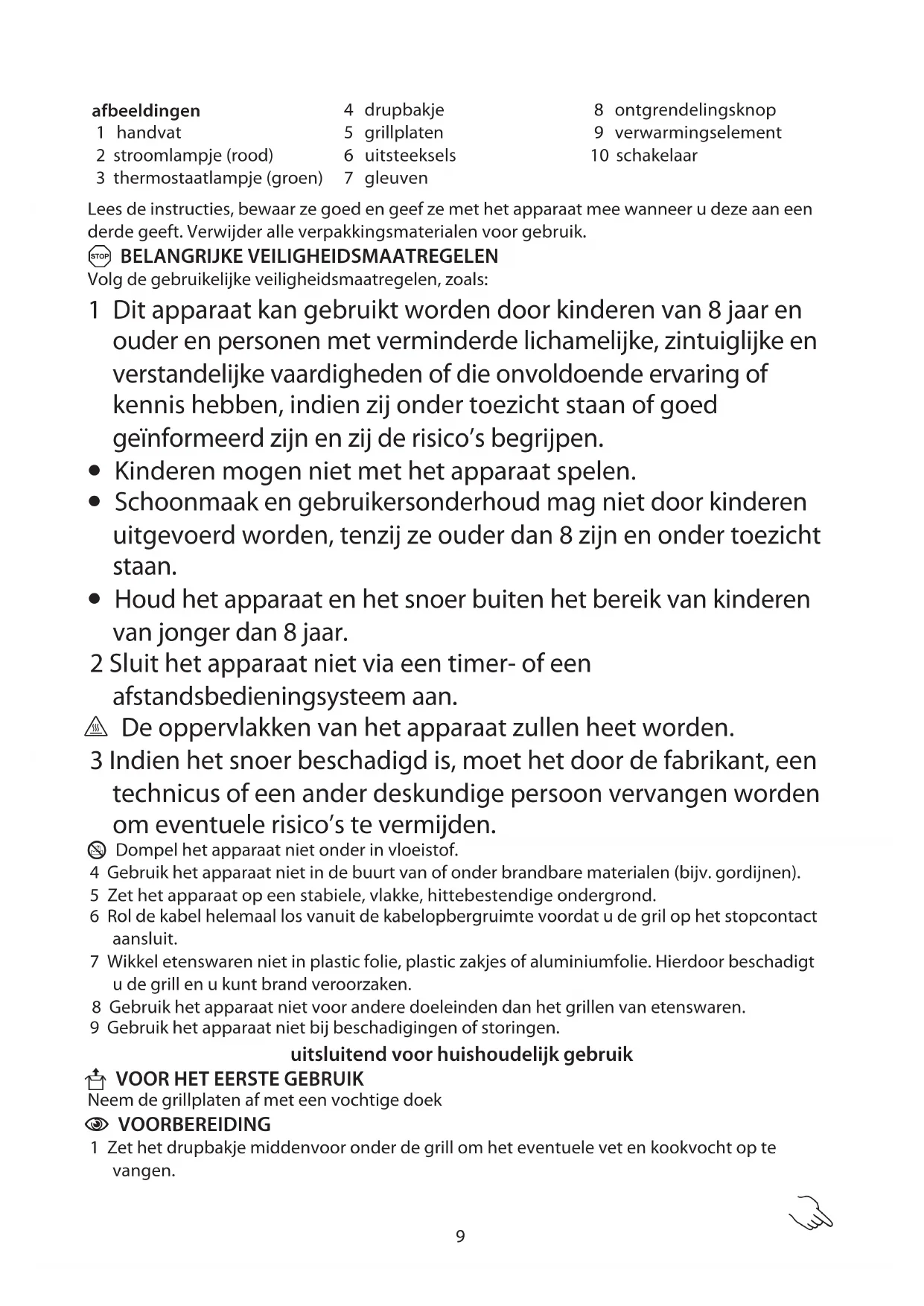 8 Gebruik het apparaat niet voor andere doeleinden dan het grillen van etenswaren.