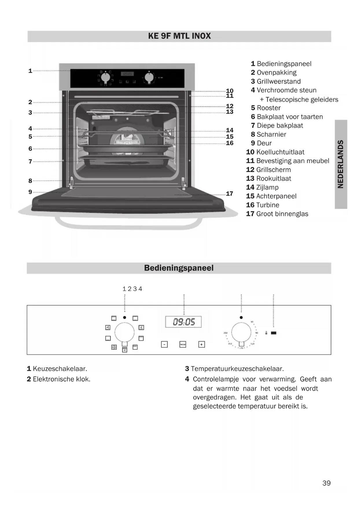 Bedieningspaneel 1 Bedieningspaneel 2 Ovenpakking 3 Grillweerstand 4 Verchroomde steun + Telescopische geleiders 5 Rooster 6 Bakplaat voor taarten 7 Diepe bakplaat 8 Scharnier 9 Deur 10 Koelluchtuitlaat 11 Bevestiging aan meubel 12 Grillscherm 13 Rookuitlaat 14 Zijlamp 15 Achterpaneel 16 Turbine 17 Groot binnenglas 1 Keuzeschakelaar. 2 Elektronische klok. 3 Temperatuurkeuzeschakelaar. 4 Controlelampje voor verwarming. Geeft aan dat er warmte naar het voedsel wordt overgedragen. Het gaat uit als de geselecteerde temperatuur bereikt is.