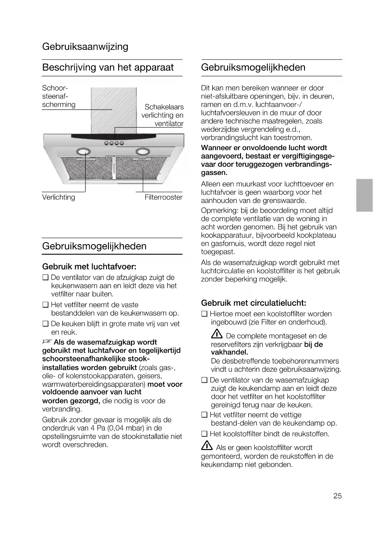 Belangrijke aanwijzingen: ❑ Deze gebruiksaanwijzing geldt voor verschillende uitvoeringen van het apparaat. Het is mogelijk dat er een aantal kenmerken worden beschrevendie niet van toepassing zijn op uw apparaat.❑ Deze afzuigkap voldoet aan de geldendeveiligheidsvoorschriften.Reparaties mogen uitsluitend wordenuitgevoerd door een vakman.Door ondeskundige reparaties kunnenaanzienlijke gevaren voor de gebruiker ontstaan.❑ Lees de gebruiksaanwijzing zorgvuldigvoordat u het nieuwe apparaat gebruikt.Ze bevat belangrijke informatie voor uwveiligheid en voor het gebruik en hetonderhoud van het apparaat.❑ Bewaar de gebruiksaanwijzing en hetmontagevoorschrift zorgvuldig, eventueelvoor een volgende bezitter van het apparaat. De kookzones moeten altijd zijn bedekt met pannen. Boven een fornuis voor vaste brandstoffen (steenkool, hout e.d.) is hetgebruik van de afzuigkap alleen beperkttoegestaan (zie montagevoorschrift).Gaskookplaten / gasfornuizen Gebruik niet alle gaskookzones tegelijk langdurig (max. 15 minuten) op de hoogstestand, anders bestaat er kans op brandwonden bij aanraking van de oppervlakken van de behuizing en gevaarvan beschadiging van de afzuigkap.Bij gebruik van de afzuigkap boven eengaskookplaat waarvan gelijktijdig drie ofmeer gaskookzones worden gebruikt, moetde afzuigkap op de maximumstand wordengezet. Indien het apparaat beschadigd is, mag u het niet in gebruik nemen. Aansluiting en ingebruikneming mogen alleen door een vakman worden uitgevoerd. Als de aansluitkabel van dit apparaat beschadigd raakt, moet deze worden vervangen door de fabrikant, diens klantenservice of een andere gekwalificeerde vakman, om gevaren tevoorkomen. Verpakkingsmateriaal volgens de voorschriften afvoeren (zie het montage-voorschrift). Deze afzuigkap mag is uitsluitend bedoeld voor huishoudelijk gebruik. Afzuigkap uitsluitend met ingeschroefde lampen gebruiken. Defecte lampen dienen onmiddellijk vervangen te worden om overbelasting vande overige lampen te voorkomen. Afzuigkap nooit zonder vetfilter gebruiken. Oververhit vet en olie is gemakkelijk ontvlambaar.Daarom gerechten met vet of olie, b.v. pata-tes frites, alleen onder toezicht toebereiden. Onder de afzuigkap niet flamberen. Brandgevaar bij het vetfilter door ! opstijgende vlammen.