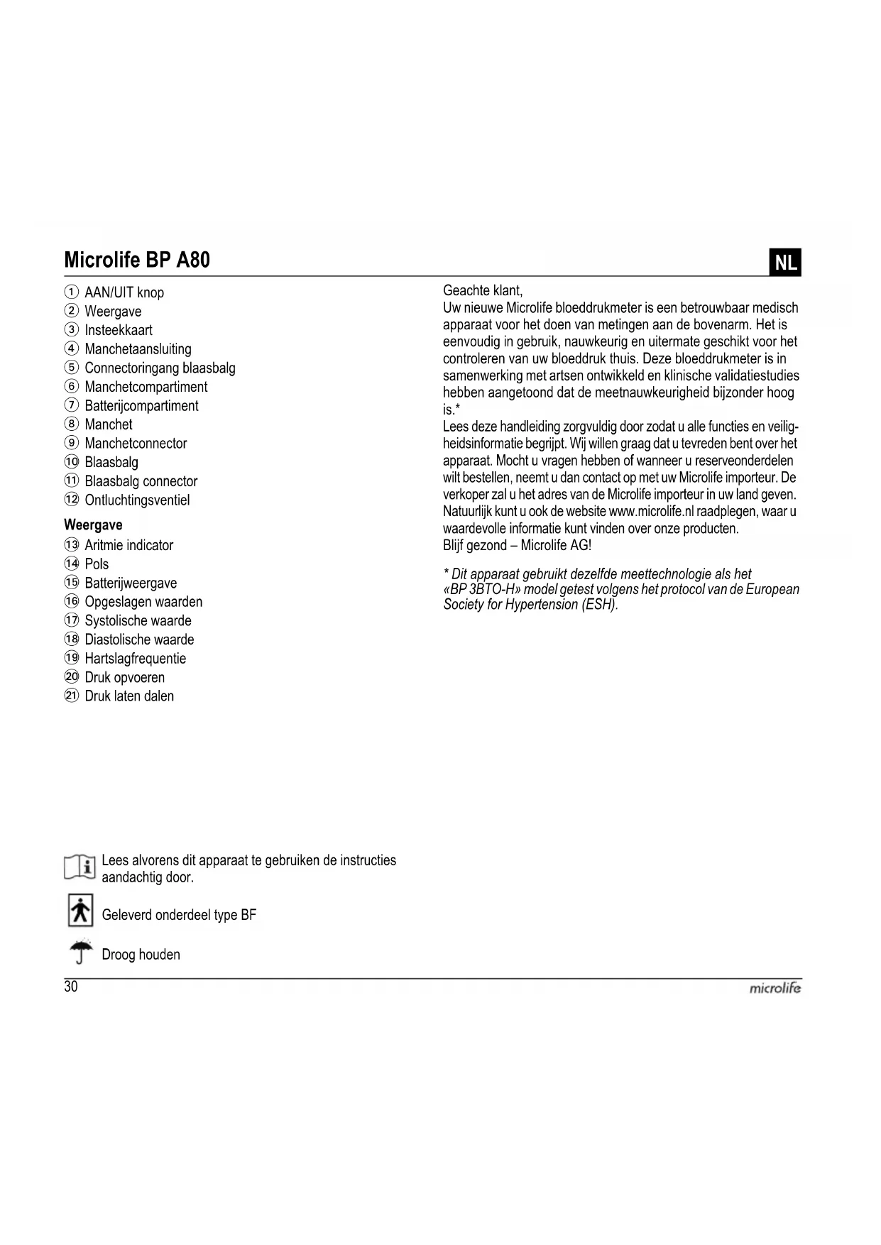 - Dit apparaat gebruikt dezelfde meettechnologie als het «BP 3BTO-H» model getest volgens het protocol van de European Society for Hypertension (ESH). Microlife BP A80