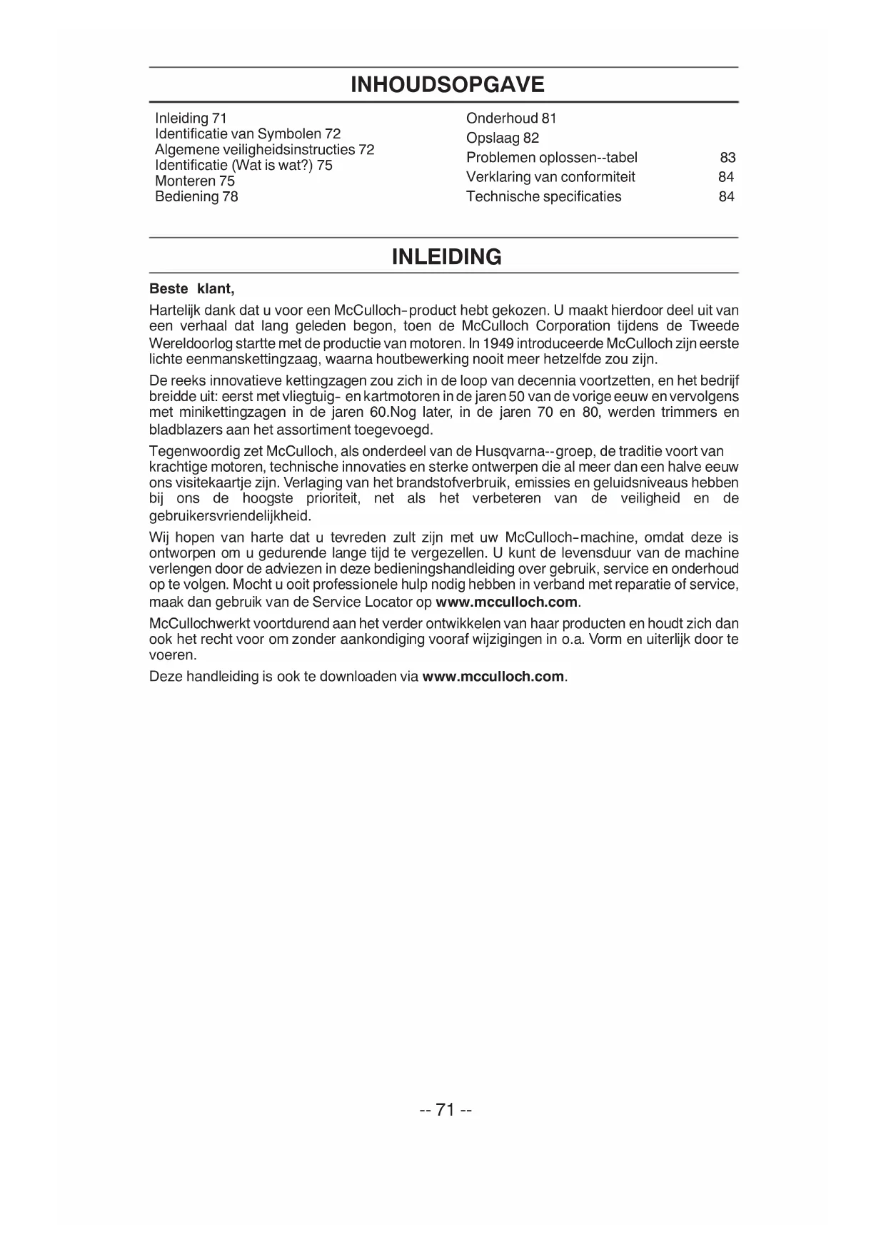 .-- 71 -- INHOUDSOPGAVE Inleiding 71 Identificatie van Symbolen 72 Algemene veiligheidsinstructies 72 Identificatie (Wat is wat?) 75 Monteren 75 Bediening 78 Onderhoud 81 Opslaag 82 Problemen oplossen--tabel 83 Verklaring van conformiteit 84 Technische specificaties 84 INLEIDING Beste klant, Hartelijk dank dat u voor een McCulloch--product hebt gekozen. U maakt hierdoor deel uit van een verhaal dat lang geleden begon, toen de McCulloch Corporation tijdens de Tweede Wereldoorlog startte met de productie van motoren. In 1949 introduceerde McCulloch zijneerste lichte eenmanskettingzaag, waarna houtbewerking nooit meer hetzelfde zou zijn. De reeks innovatieve kettingzagen zou zich in de loop van decennia voortzetten, en het bedrijf breidde uit: eerst met vliegtuig-- en kartmotoren in de jaren 50 van de vorige eeuw envervolgens met minikettingzagen in de jaren 60.Nog later, in de jaren 70 en 80, werden trimmers en bladblazers aan het assortiment toegevoegd. Tegenwoordig zet McCulloch, als onderdeel van de Husqvarna--groep, de traditie voort van krachtige motoren, technische innovaties en sterke ontwerpen die al meer dan een halve eeuw ons visitekaartje zijn. Verlaging van het brandstofverbruik, emissies en geluidsniveaus hebben bij ons de hoogste prioriteit, net als het verbeteren van de veiligheid en de gebruikersvriendelijkheid. Wij hopen van harte dat u tevreden zult zijn met uw McCulloch--machine, omdat deze is ontworpen om u gedurende lange tijd te vergezellen. U kunt de levensduur van de machine verlengen door de adviezen in deze bedieningshandleiding over gebruik, service en onderhoud op te volgen. Mocht u ooit professionele hulp nodig hebben in verband met reparatie of service, maak dan gebruik van de Service Locator op www.mcculloch.com. McCullochwerkt voortdurend aan het verder ontwikkelen van haar producten en houdt zich dan ook het recht voor om zonder aankondiging vooraf wijzigingen in o.a. Vorm en uiterlijk door te voeren. Deze handleiding is ook te downloaden via www.mcculloch.com.-- 72 --