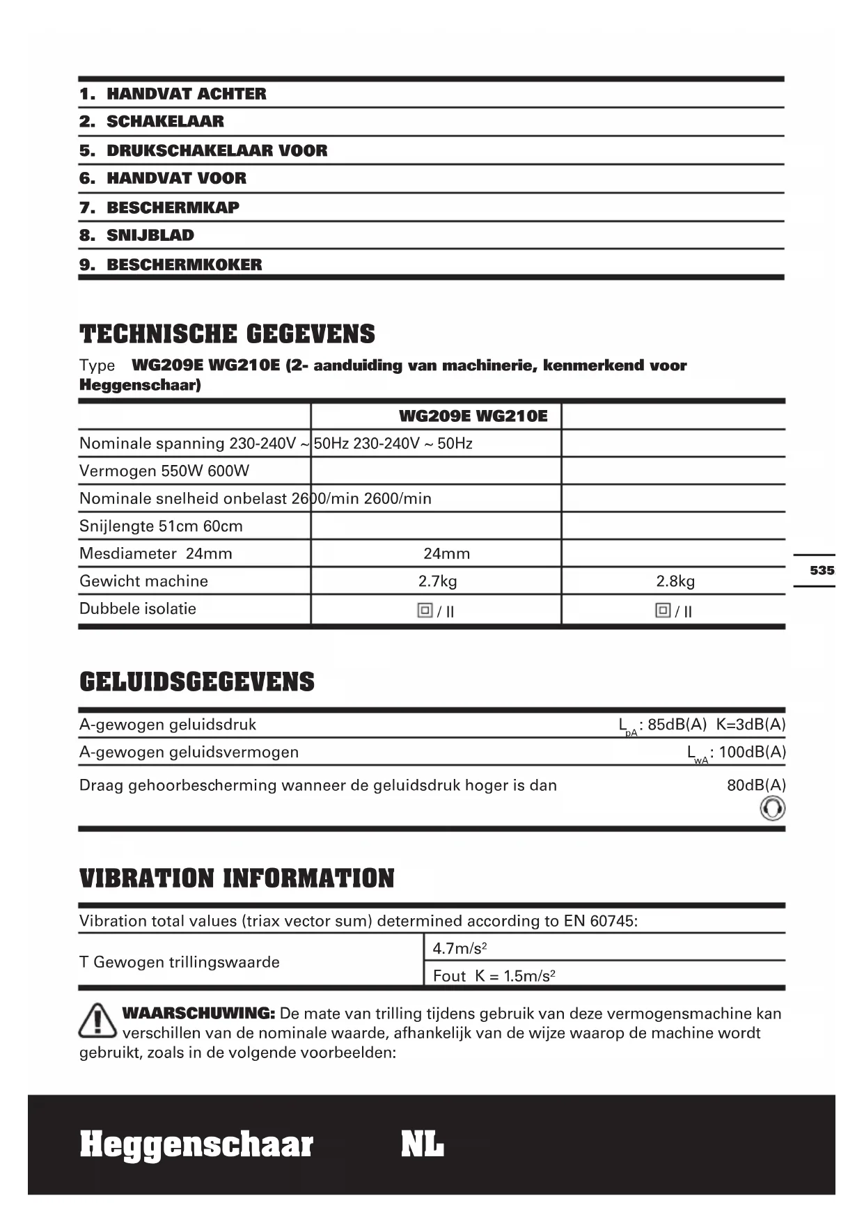 9. BESCHERMKOKER TECHNISCHE GEGEVENS Type WG209E WG210E (2- aanduiding van machinerie, kenmerkend voor