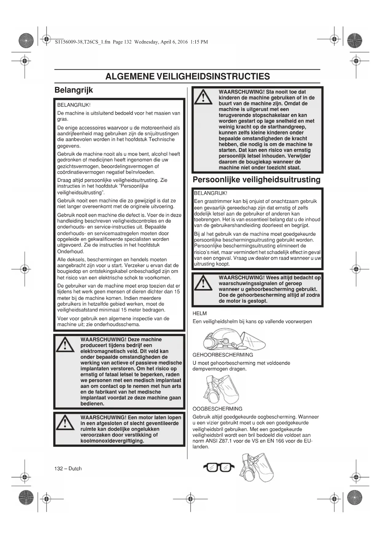 1 Trimmerkop 2 Beschermkap voor snijuitrusting 3 Steel 4 Steelkoppeling 5 Loophandvat 6 Gashendel 7 Stopschakelaar 8 Gashendelvergrendeling 9 Bougiekap en bougie 10 Starthendel 11 Brandstoftank 12 Luchtfilterdeksel 13 Brandstofpomp 14 Chokehendel 15 Gebruiksaanwijzing 16 Borgpen S1156009-38,T26CS_1.fm Page 131 Wednesday, April 6, 2016 1:15 PMALGEMENE VEILIGHEIDSINSTRUCTIES 132 – Dutch Belangrijk Persoonlijke veiligheidsuitrusting HELM Een veiligheidshelm bij kans op vallende voorwerpen GEHOORBESCHERMING U moet gehoorbescherming met voldoende dempvermogen dragen. OOGBESCHERMING Gebruik altijd goedgekeurde oogbescherming. Wanneer u een vizier gebruikt moet u ook een goedgekeurde veiligheidsbril gebruiken. Met een goedgekeurde veiligheidsbril wordt een bril bedoeld die voldoet aan norm ANSI Z87.1 voor de VS en EN 166 voor de EU- landen. BELANGRIJK! De machine is uitsluitend bedoeld voor het maaien van gras. De enige accessoires waarvoor u de motoreenheid als aandrijfeenheid mag gebruiken zijn de snijuitrustingen die aanbevolen worden in het hoofdstuk Technische gegevens. Gebruik de machine nooit als u moe bent, alcohol heeft gedronken of medicijnen heeft ingenomen die uw gezichtsvermogen, beoordelingsvermogen of coördinatievermogen negatief beïnvloeden. Draag altijd persoonlijke veiligheidsuitrusting. Zie instructies in het hoofdstuk ”Persoonlijke veiligheidsuitrusting”. Gebruik nooit een machine die zo gewijzigd is dat ze niet langer overeenkomt met de originele uitvoering. Gebruik nooit een machine die defect is. Voer de in deze handleiding beschreven veiligheidscontroles en de onderhouds- en service-instructies uit. Bepaalde onderhouds- en servicemaatregelen moeten door opgeleide en gekwalificeerde specialisten worden uitgevoerd. Zie de instructies in het hoofdstuk Onderhoud. Alle deksels, beschermingen en hendels moeten aangebracht zijn voor u start. Verzeker u ervan dat de bougiedop en ontstekingskabel onbeschadigd zijn om het risico van een elektrische schok te voorkomen. De gebruiker van de machine moet erop toezien dat er tijdens het werk geen mensen of dieren dichter dan 15 meter bij de machine komen. Indien meerdere gebruikers in hetzelfde gebied werken, moet de veiligheidsafstand minimaal 15 meter bedragen. Voer voor gebruik een algemene inspectie van de machine uit; zie onderhoudsschema.