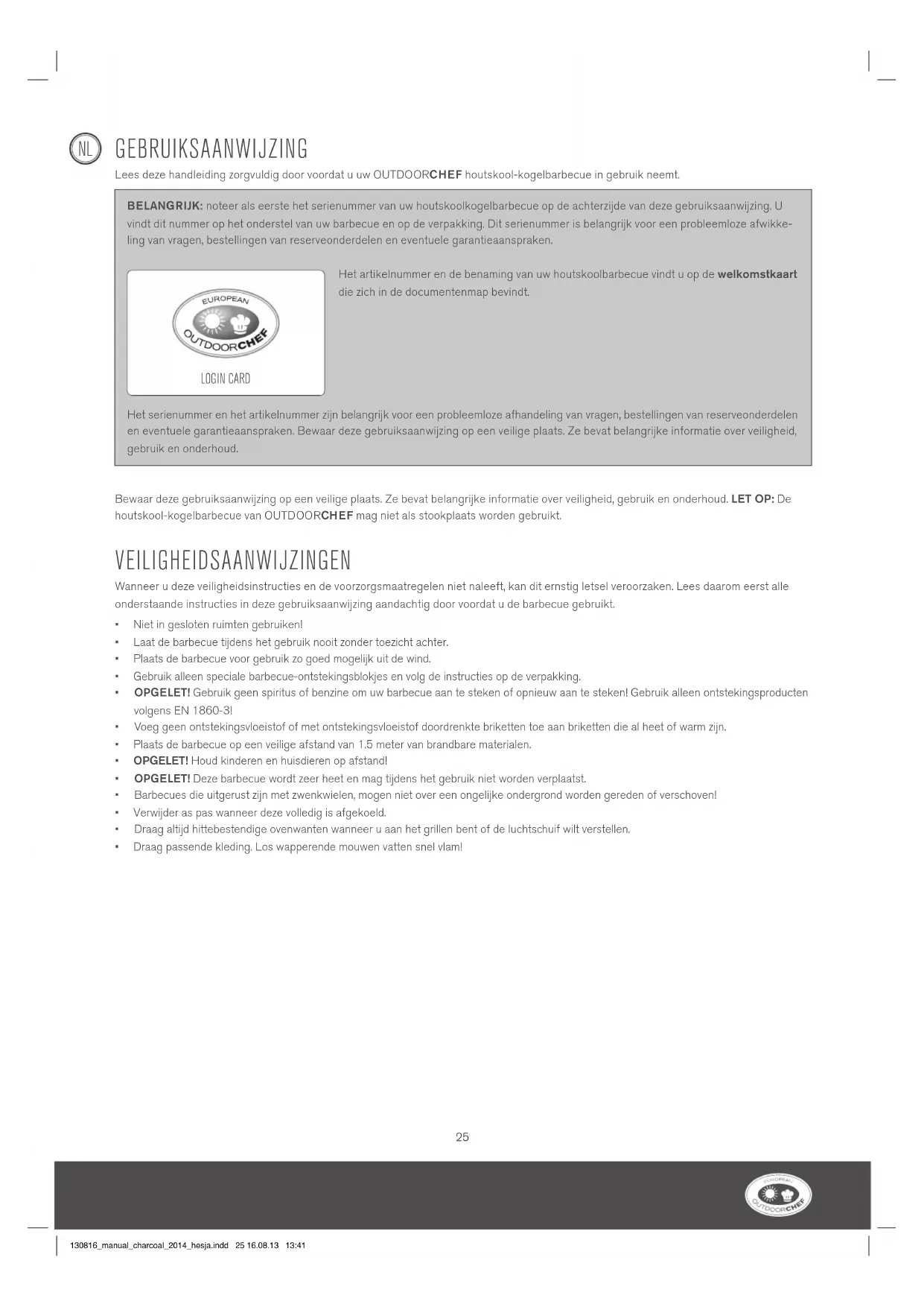 - Draag passende kleding. Los wapperende mouwen vatten snel vlam! BELANGRIJK: noteer als eerste het serienummer van uw houtskoolkogelbarbecue op de achterzijde van deze gebruiksaanwijzing. U vindt dit nummer op het onderstel van uw barbecue en op de verpakking. Dit serienummer is belangrijk voor een probleemloze afwikke- ling van vragen, bestellingen van reserveonderdelen en eventuele garantieaanspraken. Het artikelnummer en de benaming van uw houtskoolbarbecue vindt u op de welkomstkaart die zich in de documentenmap bevindt. Het serienummer en het artikelnummer zijn belangrijk voor een probleemloze afhandeling van vragen, bestellingen van reserveonderdelen en eventuele garantieaanspraken. Bewaar deze gebruiksaanwijzing op een veilige plaats. Ze bevat belangrijke informatie over veiligheid, gebruik en onderhoud. LOGIN CARD