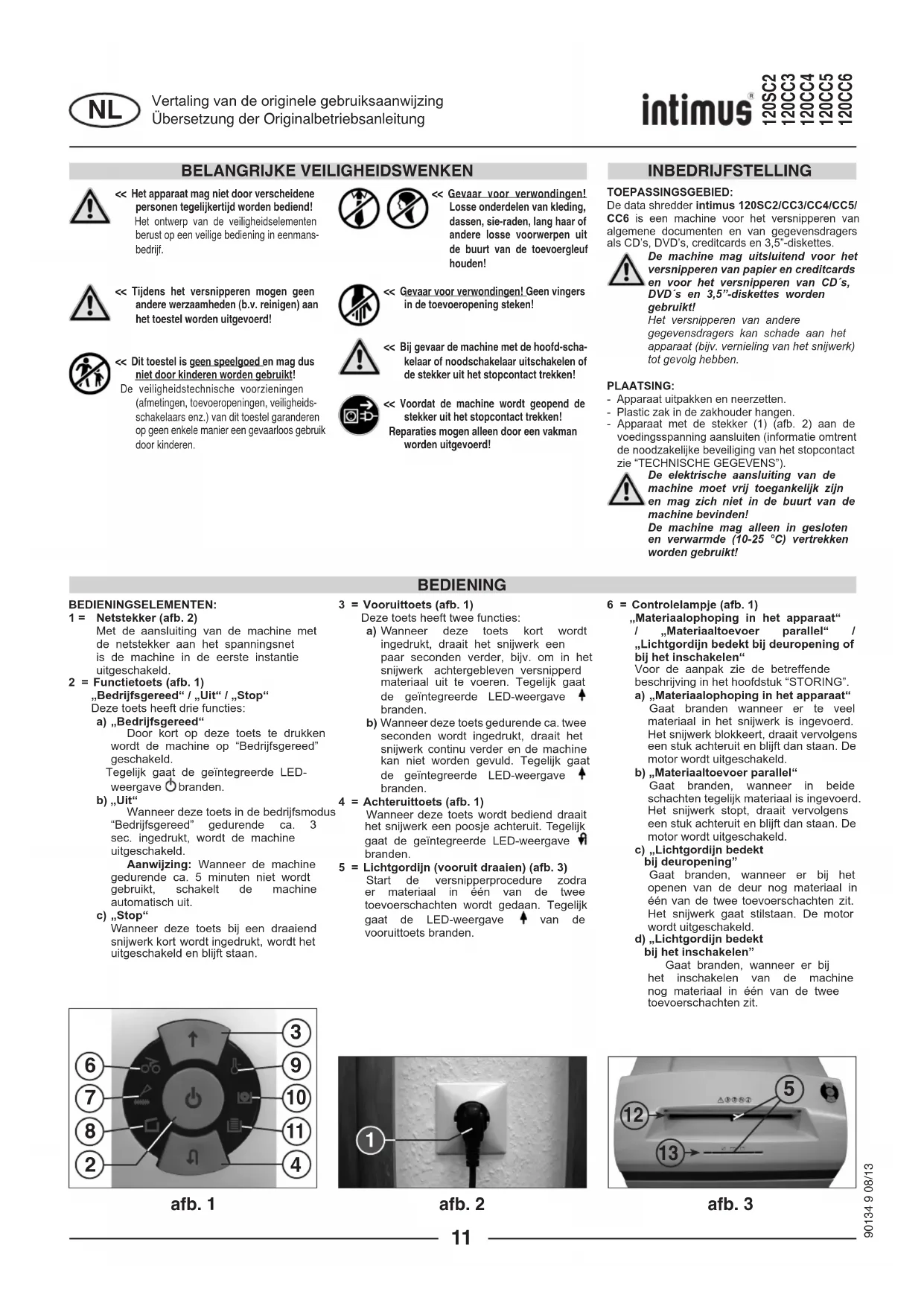 - se réfère à du papier A4 70g/m2 pour 230 V/50 Hz Fusible (à action retardée): 220-230V = 10 A / 115-125V = 15 A / 100V = 18 A Modèle Type Largeur de coupe Capacité de coupe Largeur de Niveau de bruit Dimensions Poids papier / CD,DVD papier / CD,DVD travail L x P x H intimus 120SC2 227-6S 5,8 mm / 8 mm 35-38 feuilles* / 1 pièce 310 mm ca. 57 dB(A) 535 x 395 x 980 mm 46 kg intimus 120SC2 227-4S 3,8 mm / 8 mm 31-33 feuilles* / 1 pièce 310 mm ca. 57 dB(A) 535 x 395 x 980 mm 46 kg intimus 120CC3 227-4C 3,8x36 mm / 8 mm 23-25 feuilles* / 1 pièce 310 mm ca. 57 dB(A) 535 x 395 x 980 mm 47 kg intimus 120CC4 227-2C 1,9x15 mm / 8 mm 15-17 feuilles* / 1 pièce 310 mm ca. 57 dB(A) 535 x 395 x 980 mm 47 kg intimus 120CC5 227-1C 0,8x12 mm / 8 mm 10-12 feuilles* / 1 pièce 310 mm ca. 57 dB(A) 535 x 395 x 980 mm 47 kg intimus 120CC6 227-1CF 0,8x4,5 mm / 8 mm 7-8 feuilles* / 1 pièce 310 mm ca. 57 dB(A) 535 x 395 x 980 mm 47 kg Modèle Caractéristiques branchement sur le secteur tension de raccordement/fréquence · courant absorbé · puissance intimus 120SC2 220-230V/50Hz · 7,8 A · 1,8 kW 115-1 V/60Hz · 12,0 A · 1,4 kW 100V/50/60Hz · 18,0 A · 1,8 kW intimus 120SC2 220-230V/50Hz · 7,8 A · 1,8 kW 115-1 V/60Hz · 12,0 A · 1,4 kW 100V/50/60Hz · 18,0 A · 1,8 kW intimus 120CC3 220-230V/50Hz · 7,8 A · 1,8 kW 115-1 V/60Hz · 12,0 A · 1,4 kW 100V/50/60Hz · 18,0 A · 1,8 kW intimus 120CC4 220-230V/50Hz · 7,8 A · 1,8 kW 115-1 V/60Hz · 12,0 A · 1,4 kW 100V/50/60Hz · 18,0 A · 1,8 kW intimus 120CC5 220-230V/50Hz · 7,8 A · 1,8 kW 115-125V/60Hz · 12,0 A · 1,4 kW 100V/50/60Hz · 18,0 A · 1,8 kW intimus 120CC6 220-230V/50Hz · 7,8 A · 1,8 kW 115-125V/60Hz · 12,0 A · 1,4 kW 100V/50/60Hz · 18,0 A · 1,8 kWTOEPASSINGSGEBIED:De data shredder intimus 120SC2/CC3/CC4/CC5/CC6 is een machine voor het versnipperen van algemene documenten en van gegevensdragers als CD’s, DVD’s, creditcards en 3,5”-diskettes.De machine mag uitsluitend voor het versnipperen van papier en creditcards en voor het versnipperen van CD´s, DVD´s en 3,5”-diskettes worden gebruikt!Het versnipperen van andere gegevensdragers kan schade aan het apparaat (bijv. vernieling van het snijwerk) tot gevolg hebben.PLAATSING:- Apparaat uitpakken en neerzetten.- Plastic zak in de zakhouder hangen. - Apparaat met de stekker (1) (afb. 2) aan de voedingsspanning aansluiten (informatie omtrent de noodzakelijke beveiliging van het stopcontact zie “TECHNISCHE GEGEVENS”).De elektrische aansluiting van de machine moet vrij toegankelijk zijn en mag zich niet in de buurt van de machine bevinden!De machine mag alleen in gesloten en verwarmde (10-25 °C) vertrekken worden gebruikt! BELANGRIJKE VEILIGHEIDSWENKEN << Gevaar voor verwondingen! Losse onderdelen van kleding, dassen, sie-raden, lang haar of andere losse voorwerpen uit de buurt van de toevoergleuf houden!<< Gevaar voor verwondingen! Geen vingers in de toevoeropening steken!<< Bij gevaar de machine met de hoofd-scha-kelaar of noodschakelaar uitschakelen of de stekker uit het stopcontact trekken!<< Voordat de machine wordt geopend de stekker uit het stopcontact trekken! Reparaties mogen alleen door een vakman worden uitgevoerd!<< Het apparaat mag niet door verscheidene personen tegelijkertijd worden bediend! Het ontwerp van de veiligheidselementen berust op een veilige bediening in eenmans-bedrijf.<< Tijdens het versnipperen mogen geen andere werzaamheden (b.v. reinigen) aan het toestel worden uitgevoerd!<< Dit toestel is geen speelgoed en mag dus niet door kinderen worden gebruikt! De veiligheidstechnische voorzieningen (afmetingen, toevoeropeningen, veiligheids-schakelaars enz.) van dit toestel garanderen op geen enkele manier een gevaarloos gebruik door kinderen. 120SC2 120CC3 120CC4 120CC5 120CC6