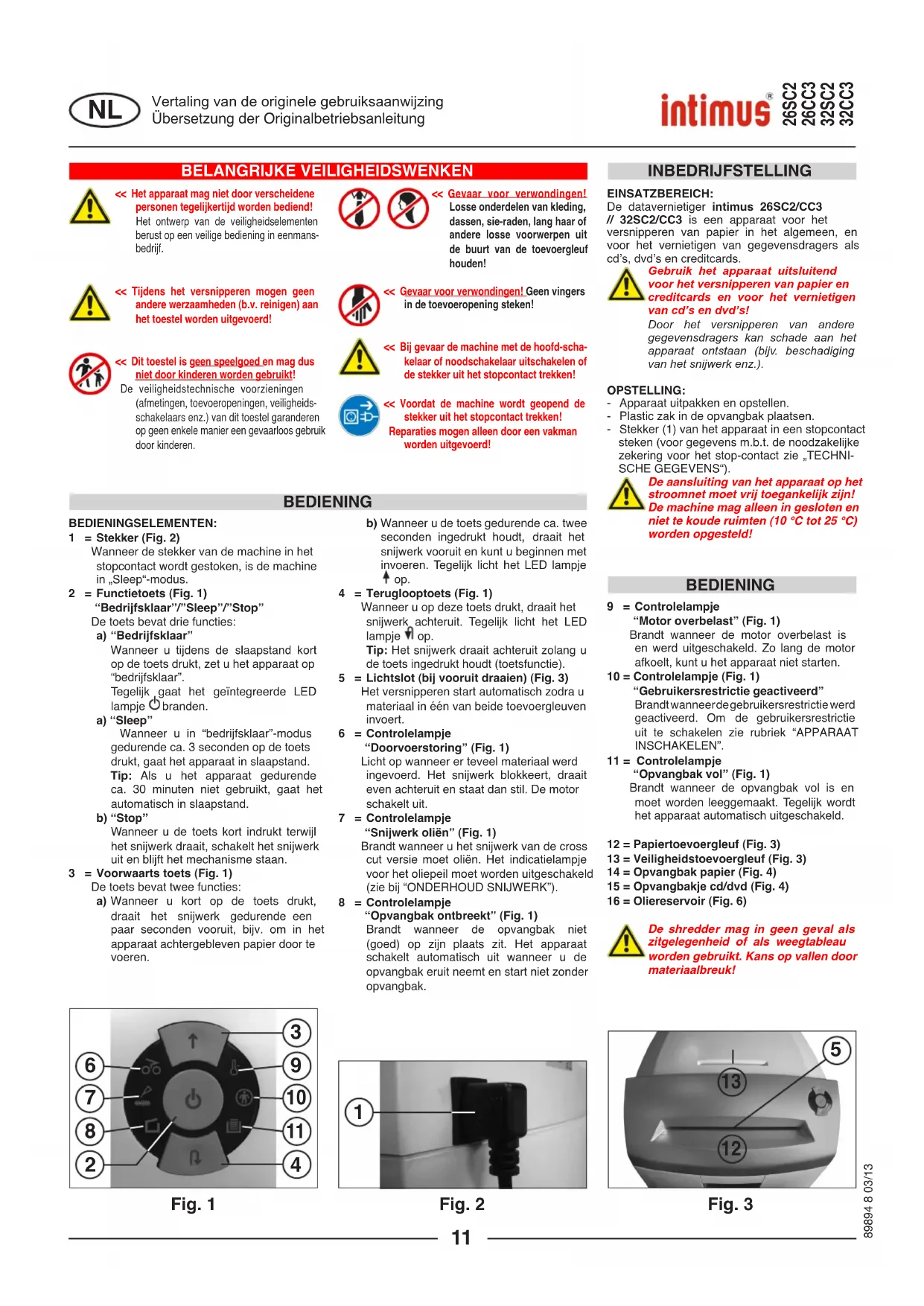 - se réfère à du papier A4 70g/m2 pour 230 V/50 Hz -10% COMMENTREMEDIERAUXPETITESPANNES CARACTÉRISTIQUESTECHNIQUES ACCESSOIRES SEPARES Désignation Ordre-No.Sac en plastique, 300x300x700x0,018 mm 99925Flacon d’huile special, 110 ml 88035Notez:Pour les accessoires et pièces détachées, veuillez contacter votre agent.g.5g.6 Traduction de Mode d'emploi d‘origine Übersetzung der Originalbetriebsanleitung Modèle Caractéristiques branchement sur le secteur tension de raccordement/fréquence · courant absorbé · puissance intimus 26SC2 220-240V/50Hz · 1,7 A · 0,39 kW 120V/60Hz · 2,9 A · 0,35 kW intimus 26CC3 220-240V/50Hz · 1,7 A · 0,39 kW 120V/60Hz · 2,9 A · 0,35 kW intimus 32SC2 220-240V/50Hz · 1,9 A · 0,44 kW 120V/60Hz · 3,5 A · 0,42 kW intimus 32CC3 220-240V/50Hz · 1,9 A · 0,44 kW 120V/60Hz · 3,5 A · 0,42 kW Modèle Type Largeur de coupe Capacité de coupe Largeur de travail Niveau de bruit Sevice intermittent Dimensions Poids papier / CD,DVD papier / CD,DVD MARCHE / ARRET L x P x H intimus 26SC2 276-4S 4 mm / 8 mm 13 feuilles* / 1 pièce 240 mm ca. 55 dB(A) 10 / 45 min 390 x 330 x 550 mm 16 kg intimus 26CC3 276-4C 4x28 mm / 8 mm 9 feuilles* / 1 pièce 240 mm ca. 55 dB(A) 10 / 45 min 390 x 330 x 550 mm 16,2 kg intimus 32SC2 277-4S 4 mm / 8 mm 17 feuilles* / 1 pièce 240 mm ca. 55 dB(A) 10 / 45 min 390 x 360 x 600 mm 16,5 kg intimus 32CC3 277-4C 4x28 mm / 8 mm 12 feuilles* / 1 pièce 240 mm ca. 55 dB(A) 10 / 45 min 390 x 360 x 600 mm 16,7 kg Fusible (à action retardée): 220-240V = 10 A / 120V = 15 A << Gevaar voor verwondingen! Losse onderdelen van kleding, dassen, sie-raden, lang haar of andere losse voorwerpen uit de buurt van de toevoergleuf houden!<< Gevaar voor verwondingen! Geen vingers in de toevoeropening steken!<< Bij gevaar de machine met de hoofd-scha-kelaar of noodschakelaar uitschakelen of de stekker uit het stopcontact trekken!<< Voordat de machine wordt geopend de stekker uit het stopcontact trekken! Reparaties mogen alleen door een vakman worden uitgevoerd!<< Het apparaat mag niet door verscheidene personen tegelijkertijd worden bediend! Het ontwerp van de veiligheidselementen berust op een veilige bediening in eenmans-bedrijf.<< Tijdens het versnipperen mogen geen het toestel worden uitgevoerd!<< Dit toestel is geen speelgoed en mag dus niet door kinderen worden gebruikt! De veiligheidstechnische voorzieningen (afmetingen, toevoeropeningen, veiligheids-schakelaars enz.) van dit toestel garanderen op geen enkele manier een gevaarloos gebruik door kinderen.De datavernietiger intimus 26SC2/CC3 // 32SC2/CC3 is een apparaat voor het versnipperen van papier in het algemeen, en voor het vernietigen van gegevensdragers als cd’s, dvd’s en creditcards.Gebruik het apparaat uitsluitend voor het versnipperen van papier en creditcards en voor het vernietigen van cd’s en dvd’s! Door het versnipperen van andere gegevensdragers kan schade aan het apparaat ontstaan (bijv. beschadiging van het snijwerk enz.).- Apparaat uitpakken en opstellen.- Plastic zak in de opvangbak plaatsen.- Stekker (1) van het apparaat in een stopcontact steken (voor gegevens m.b.t. de noodzakelijke zekering voor het stop-contact zie „TECHNI- SCHE GEGEVENS“).De aansluiting van het apparaat op het stroomnet moet vrij toegankelijk zijn!De machine mag alleen in gesloten en niet te koude ruimten (10 °C tot 25 °C) worden opgesteld!9 = Controlelampje Brandt wanneer de motor overbelast is en werd uitgeschakeld. Zo lang de motor afkoelt, kunt u het apparaat niet starten. Brandt wanneer de gebruikersrestrictie werd geactiveerd. Om de gebruikersrestrictie uit te schakelen zie rubriek “APPARAAT INSCHAKELEN”.11 = Controlelampje Brandt wanneer de opvangbak vol is en moet worden leeggemaakt. Tegelijk wordt het apparaat automatisch uitgeschakeld. De shredder mag in geen geval als zitgelegenheid of als weegtableau worden gebruikt. Kans op vallen door materiaalbreuk! Wanneer de stekker van de machine in het stopcontact wordt gestoken, is de machine in „Sleep“-modus. De toets bevat drie functies: