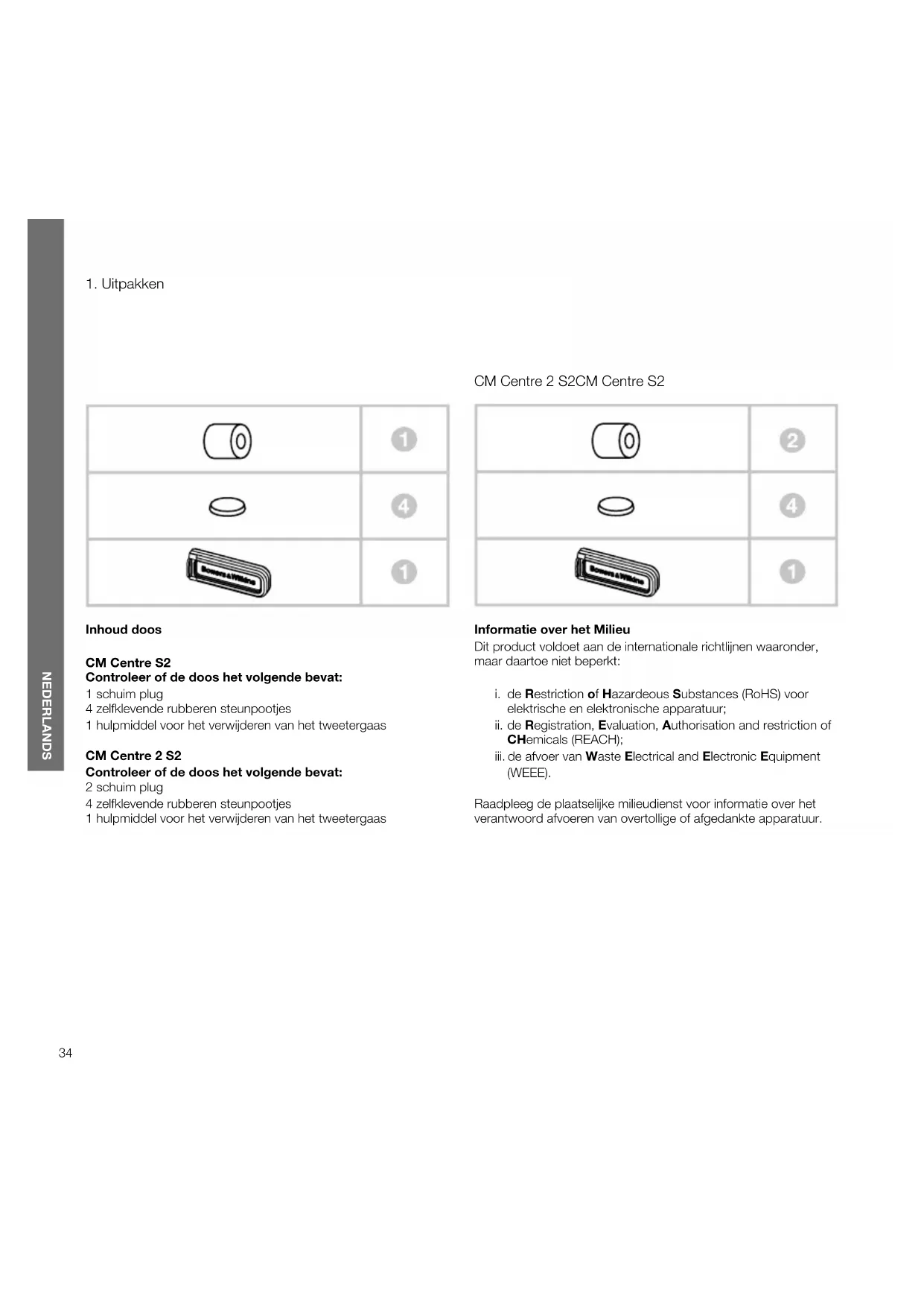 Inhoud doos CM Centre S2 Controleer of de doos het volgende bevat: 1 schuim plug 4 zelfklevende rubberen steunpootjes 1 hulpmiddel voor het verwijderen van het tweetergaas CM Centre 2 S2 Controleer of de doos het volgende bevat: 2 schuim plug 4 zelfklevende rubberen steunpootjes 1 hulpmiddel voor het verwijderen van het tweetergaas Informatie over het Milieu Dit product voldoet aan de internationale richtlijnen waaronder, maar daartoe niet beperkt: