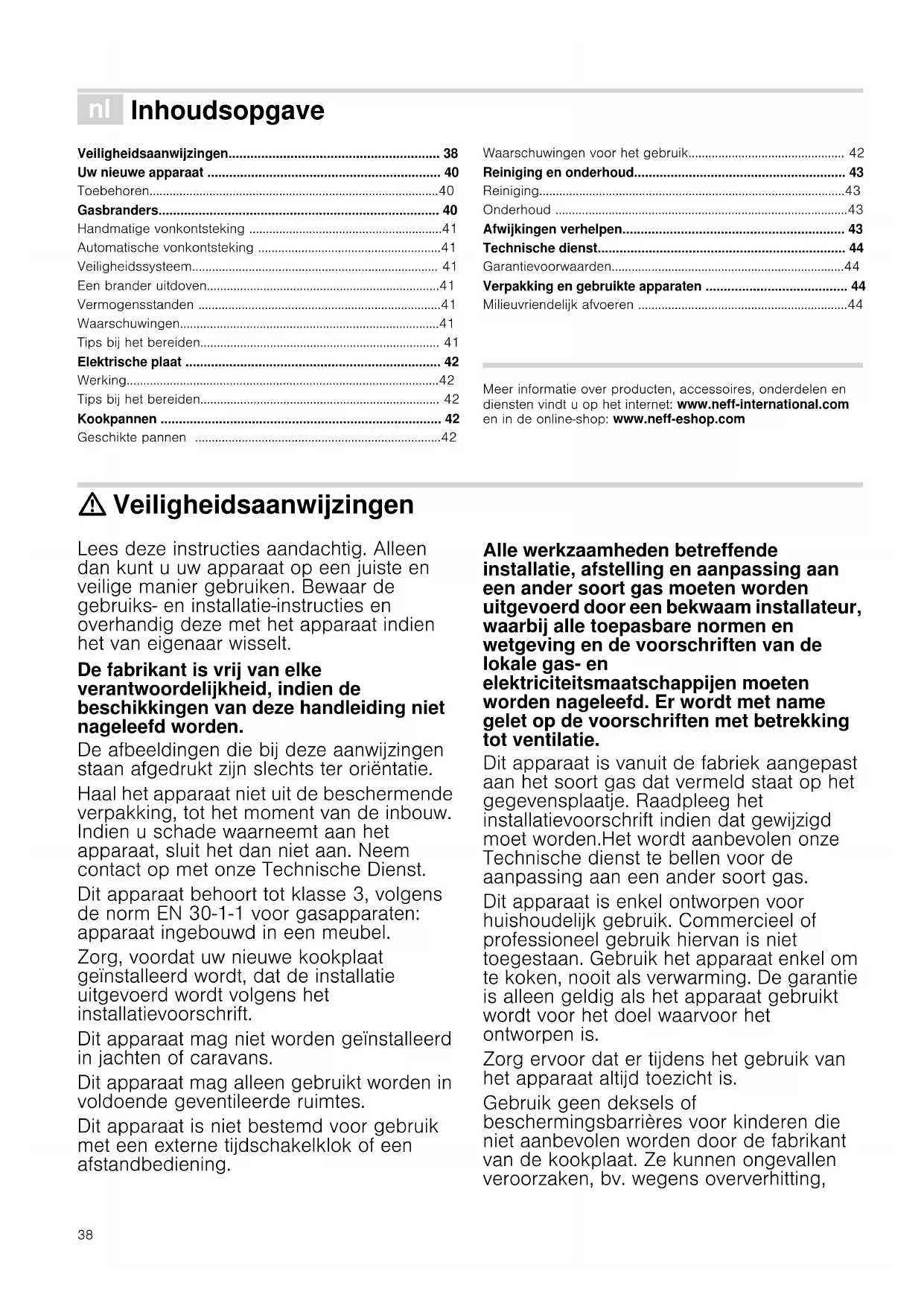 é Inhoudsopgave [nl]Gebruiksaanwijzing Veiligheidsaanwijzingen 38