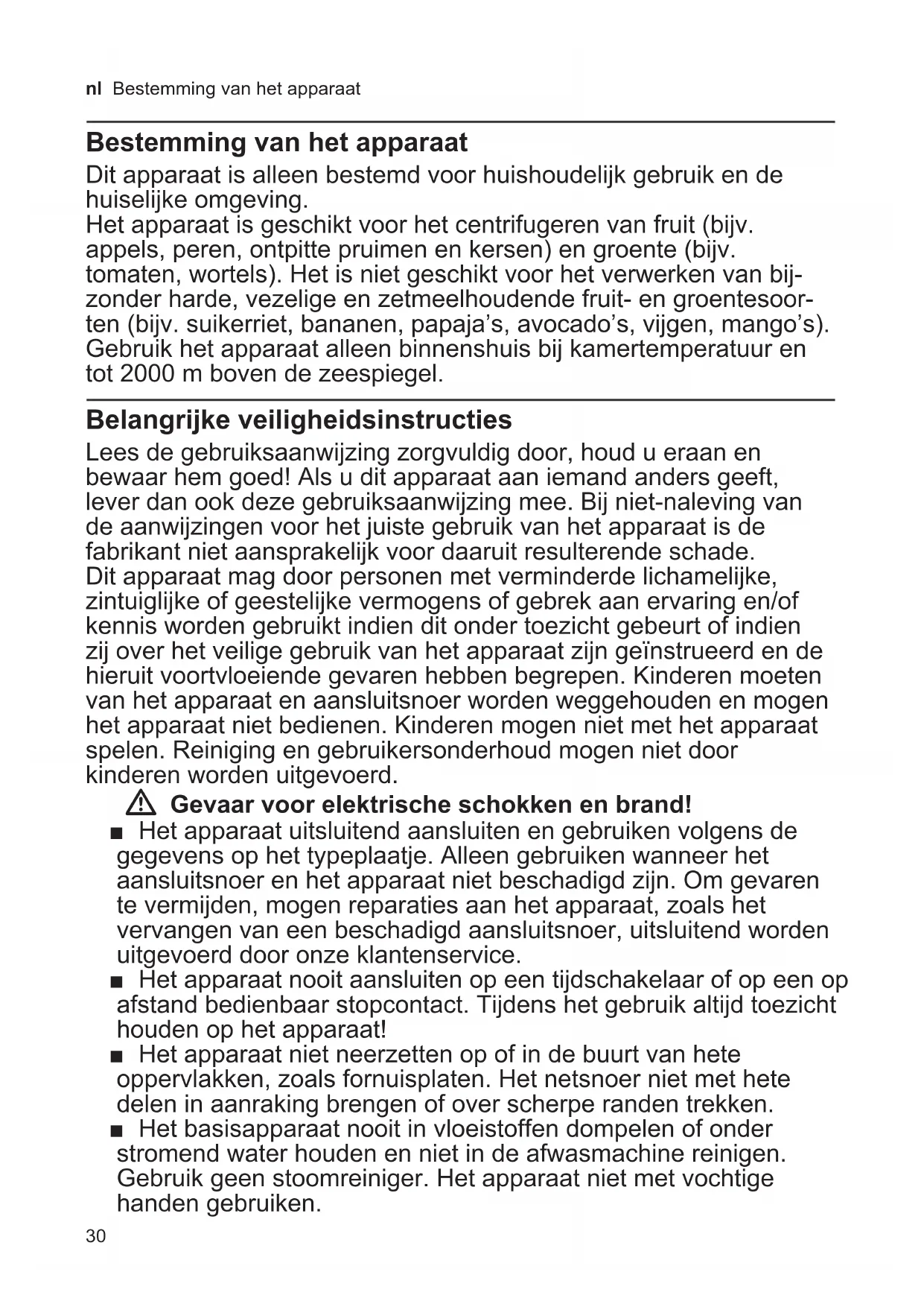 - Belangrijke veiligheidsinstructies ■ Het apparaat moet na ieder gebruik, als er geen toezicht aanwezig is, voor de montage, demontage of reiniging en bij storingen altijd van het net worden gescheiden. W Gevaar voor letsel! ■ Voor elk gebruik moet het hele apparaat, vooral de zeef en het zeefbakje, worden gecontroleerd op beschadiging (scheuren, barsten). Het apparaat niet gebruiken wanneer de zeef of het deksel beschadigd is of zichtbare scheuren vertoont. ■ Voordat u toebehoren of hulpstukken vervangt die bewegen tijdens het gebruik, moet het apparaat worden uitgeschakeld en worden losgemaakt van het stroomnet. Na het uitschakelen loopt de aandrijving nog even na. Wacht tot de aandrijving geheel stilstaat. ■ Gebruik het apparaat uitsluitend in volledig gemonteerde toestand. Wees voorzichtig bij het sluiten van de sluitbeugel, om te voorkomen dat uw vingers bekneld raken. ■ Het apparaat is bedoeld voor gebruik door één persoon. ■ Niet met de vingers in de vulopening grijpen. Altijd de bijgevoegde stopper gebruiken! ■ Voorzichtig bij de omgang met de raspmessen, bij het legen van het reservoir en bij het reinigen. De raspmessen op de bodem van de zeef niet aanraken. Voor het reinigen de zeef eerst met een borstel en dan onder stromend water of in de vaatwasser reinigen. W Verstikkingsgevaar! Laat kinderen niet met verpakkingsmateriaal spelen. W Attentie! ■ Wij adviseren u het apparaat niet langer ingeschakeld te laten dan nodig is voor het verwerken van het levensmiddel. Niet onbelast laten lopen. ■ Het apparaat uitsluitend in- en uitschakelen met de draaischakelaar. W Belangrijk! ■ Verwerk alleen rijp(e) en niet-bevroren fruit en groente. Bij onrijp fruit en onrijpe groente raakt de zeef zeer snel verstopt. ■ Pulpbak leegmaken voordat de pulp de rand van het zeefbakje bereikt. ■ Trillingen van het apparaat tijdens het centrifugeren wijzen op een verstopte of beschadigde zeef. Het apparaat direct uitschakelen. Zeef controleren. Een beschadigde zeef niet meer gebruiken! ■ Na elk gebruik of als u het apparaat langere tijd niet hebt gebruikt, dient u het altijd grondig te reinigen. X “Reiniging en verzorging” zie pagina 3432 nl Inhoud Hartelijk gefeliciteerd met de aankoop van uw nieuwe Bosch-apparaat. Meer informatie over onze producten vindt u op onze internetsite. Inhoud Bestemming van het apparaat p. 30