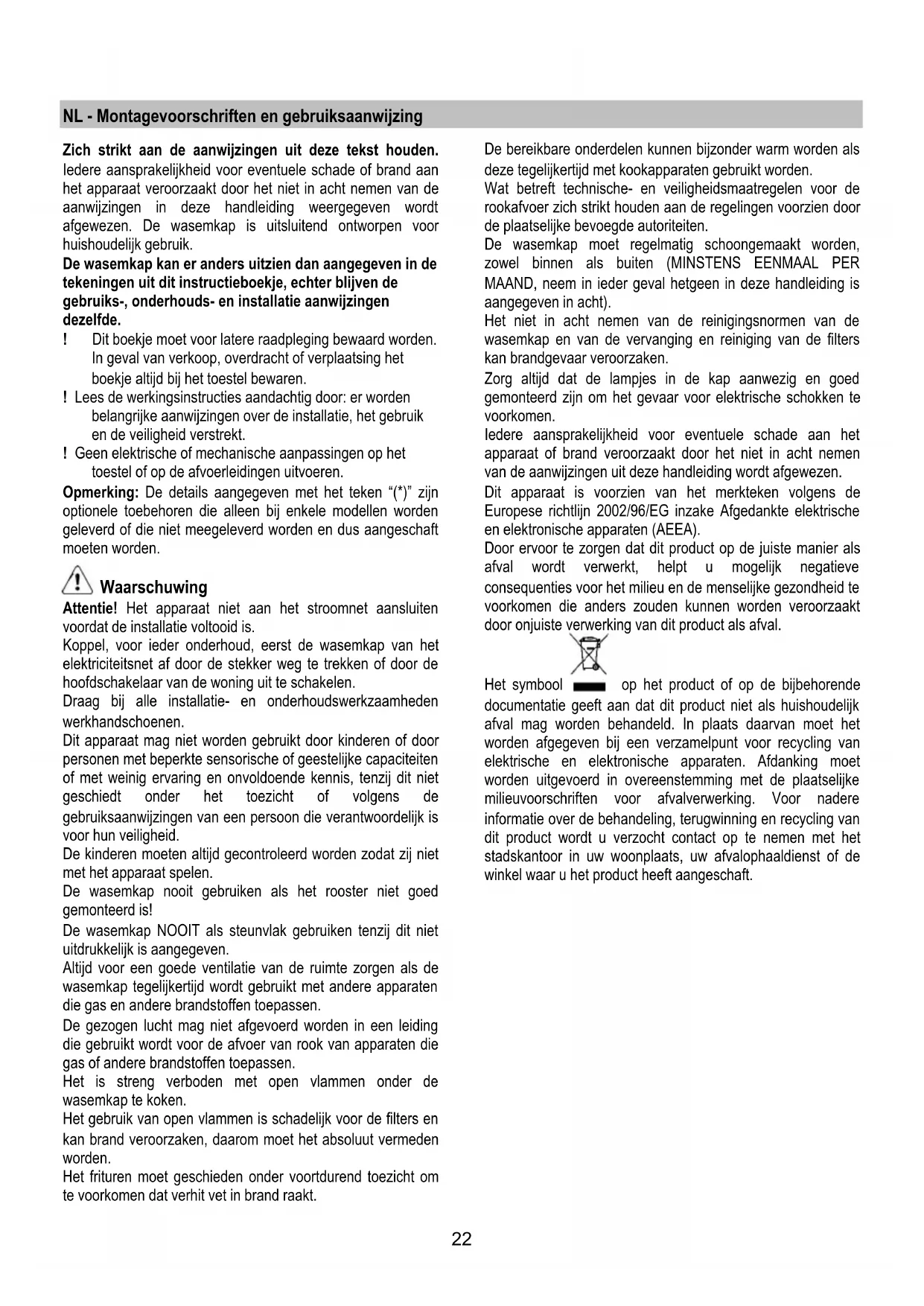 De wasemkap kan er anders uitzien dan aangegeven in de tekeningen uit dit instructieboekje, darüber blijven de gebruiks-, onderhouds- en installmentie aanwijzingendezelfde.