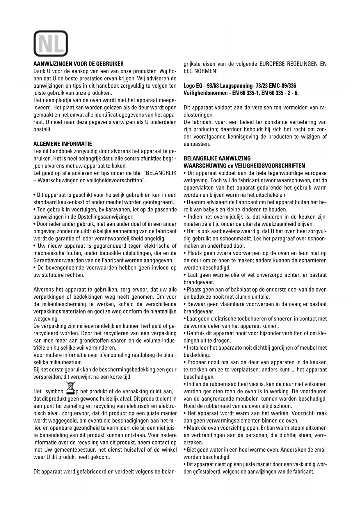 Veiligheidsnormen - EN 60 335-1, EN 60 335 - 2 - 6.