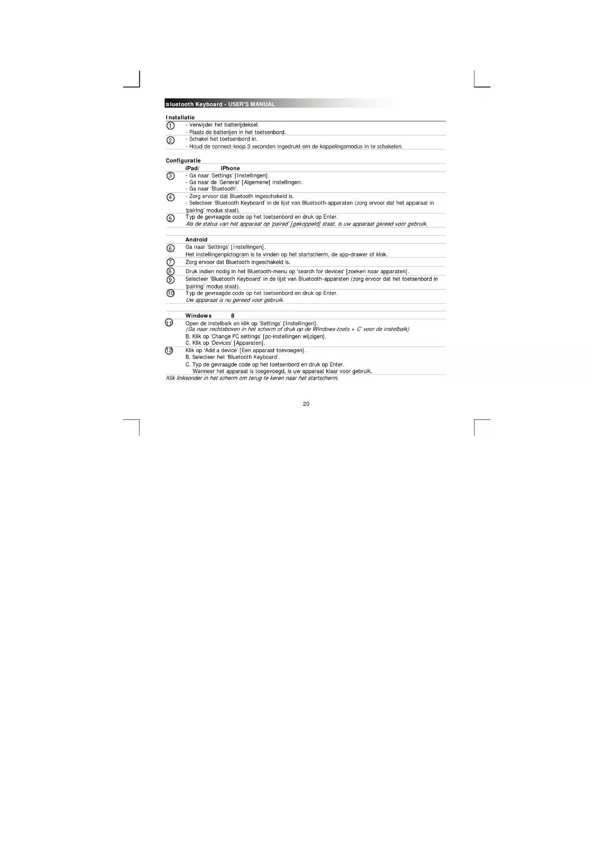 Installatie - Verwijder het batterijdeksel. - Plaats de batterijen in het toetsenbord. - Schakel het toetsenbord in. - Houd de connect-knop 3 seconden ingedrukt om de koppelingsmodus in te schakelen. Configuratie iPad/ iPhone - Ga naar ‘Settings’ [Instellingen]. - Ga naar de ‘General’ [Algemene] instellingen. - Ga naar ‘Bluetooth’. - Zorg ervoor dat Bluetooth ingeschakeld is. - Selecteer ‘Bluetooth Keyboard’ in de lijst van Bluetooth-apparaten (zorg ervoor dat het apparaat in