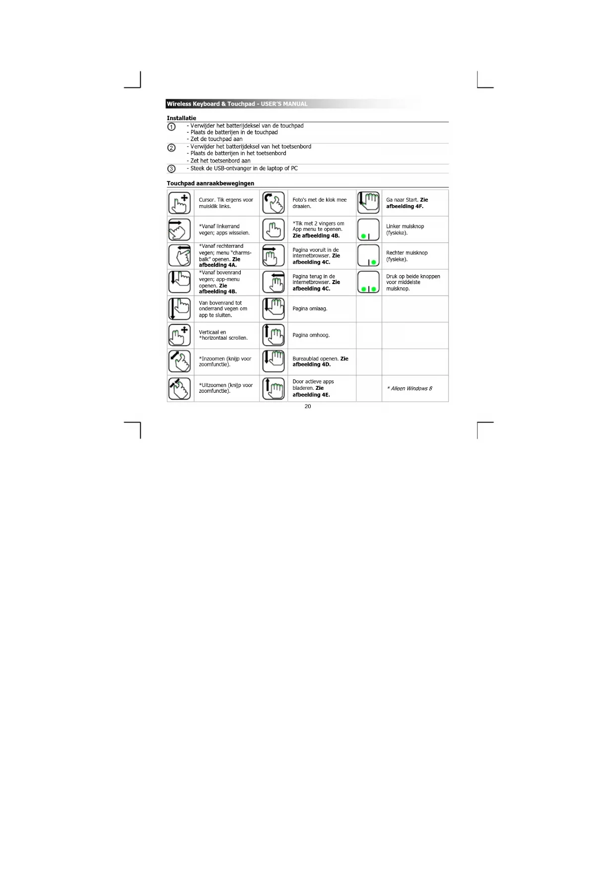 erwijder het batterijdeksel van het toetsenbord - Plaats de batterijen in het toetsenbord - Zet het toetsenbord aan - Steek de USB-ontvanger in de laptop of PC Touchpad aanraakbewegingen