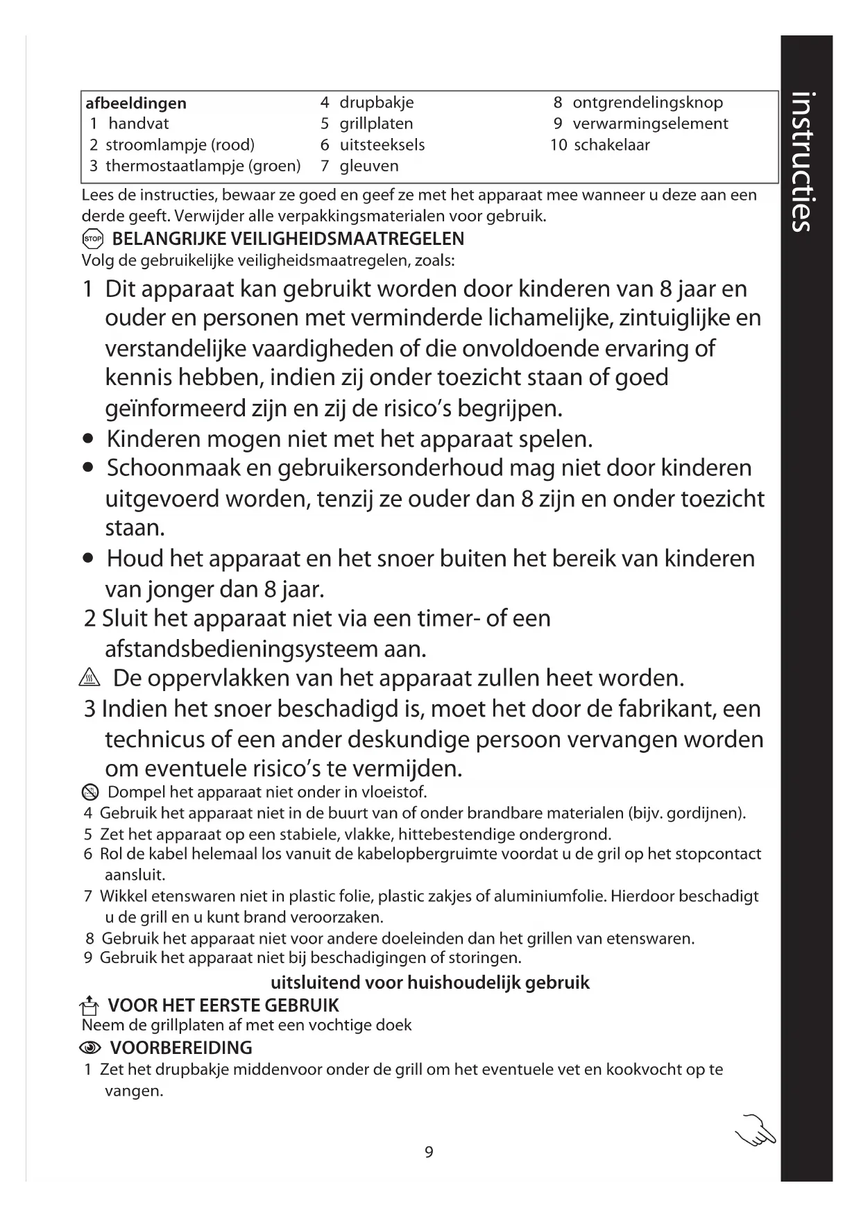 8 Gebruik het apparaat niet voor andere doeleinden dan het grillen van etenswaren.