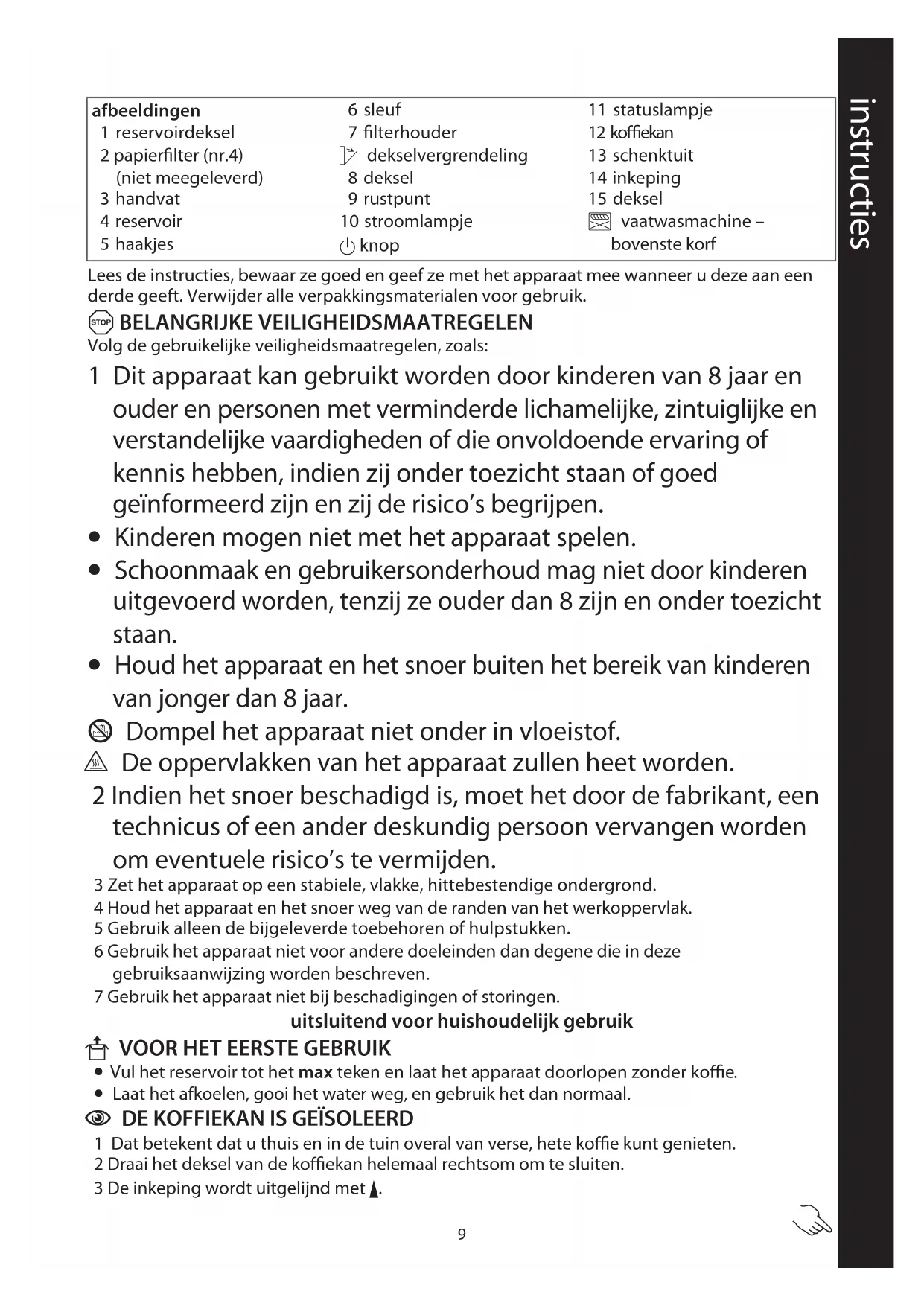 •Vul het reservoir tot het max teken en laat het apparaat doorlopen zonder koffie. •Laat het afkoelen, gooi het water weg, en gebruik het dan normaal. C DE KOFFIEKAN IS GEÏSOLEERD 1 Dat betekent dat u thuis en in de tuin overal van verse, hete koffie kunt genieten.2 Draai het deksel van de koffiekan helemaal rechtsom om te sluiten.3 De inkeping wordt uitgelijnd met (. instructies afbeeldingen1 reservoirdeksel2 papierfilter (nr.4) (niet meegeleverd)3 handvat4 reservoir5 haakjes6 sleuf7 filterhouderkdekselvergrendeling8 deksel9 rustpunt10 stroomlampje2 knop11 statuslampje12 koffiekan13 schenktuit14 inkeping15 deksel¬ vaatwasmachine – bovenste korf10