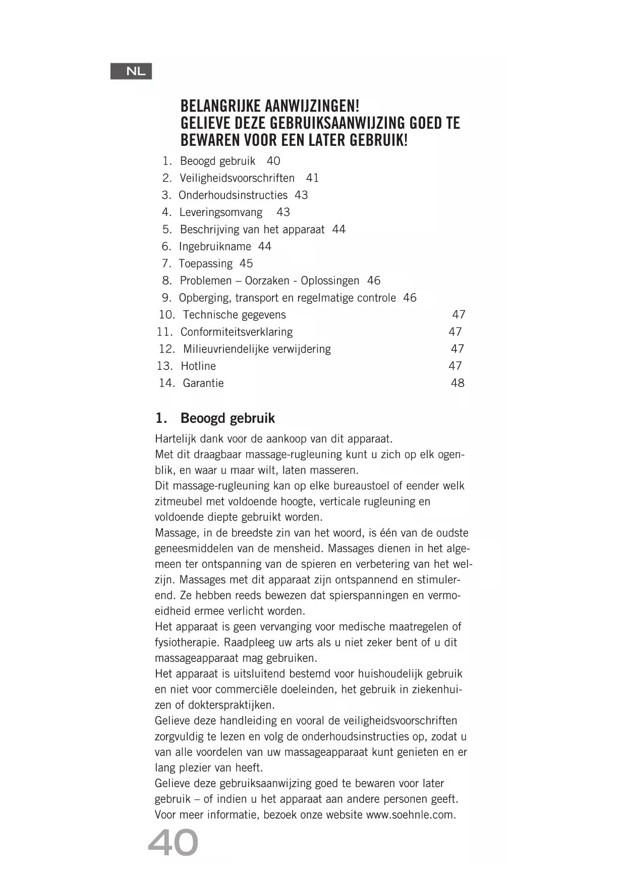 Hartelijk dank voor de aankoop van dit apparaat. Met dit draagbaar massage-rugleuning kunt u zich op elk ogen- blik, en waar u maar wilt, laten masseren. Dit massage-rugleuning kan op elke bureaustoel of eender welk zitmeubel met voldoende hoogte, verticale rugleuning en voldoende diepte gebruikt worden. Massage, in de breedste zin van het woord, is één van de oudste geneesmiddelen van de mensheid. Massages dienen in het alge- meen ter ontspanning van de spieren en verbetering van het wel- zijn. Massages met dit apparaat zijn ontspannend en stimuler- end. Ze hebben reeds bewezen dat spierspanningen en vermo- eidheid ermee verlicht worden. Het apparaat is geen vervanging voor medische maatregelen of fysiotherapie. Raadpleeg uw arts als u niet zeker bent of u dit massageapparaat mag gebruiken. Het apparaat is uitsluitend bestemd voor huishoudelijk gebruik en niet voor commerciële doeleinden, het gebruik in ziekenhui- zen of dokterspraktijken. Gelieve deze handleiding en vooral de veiligheidsvoorschriften zorgvuldig te lezen en volg de onderhoudsinstructies op, zodat u van alle voordelen van uw massageapparaat kunt genieten en er lang plezier van heeft. Gelieve deze gebruiksaanwijzing goed te bewaren voor later gebruik – of indien u het apparaat aan andere personen geeft. Voor meer informatie, bezoek onze website www.soehnle.com. BELANGRIJKE AANWIJZINGEN!