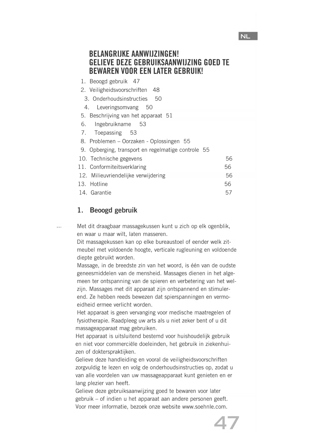 massageapparaat mag gebruiken. Het apparaat is uitsluitend bestemd voor huishoudelijk gebruik en niet voor commerciële doeleinden, het gebruik in ziekenhui- zen of dokterspraktijken. Gelieve deze handleiding en vooral de veiligheidsvoorschriften zorgvuldig te lezen en volg de onderhoudsinstructies op, zodat u van alle voordelen van uw massageapparaat kunt genieten en er lang plezier van heeft. Gelieve deze gebruiksaanwijzing goed te bewaren voor later gebruik – of indien u het apparaat aan andere personen geeft. Voor meer informatie, bezoek onze website www.soehnle.com. BELANGRIJKE AANWIJZINGEN!