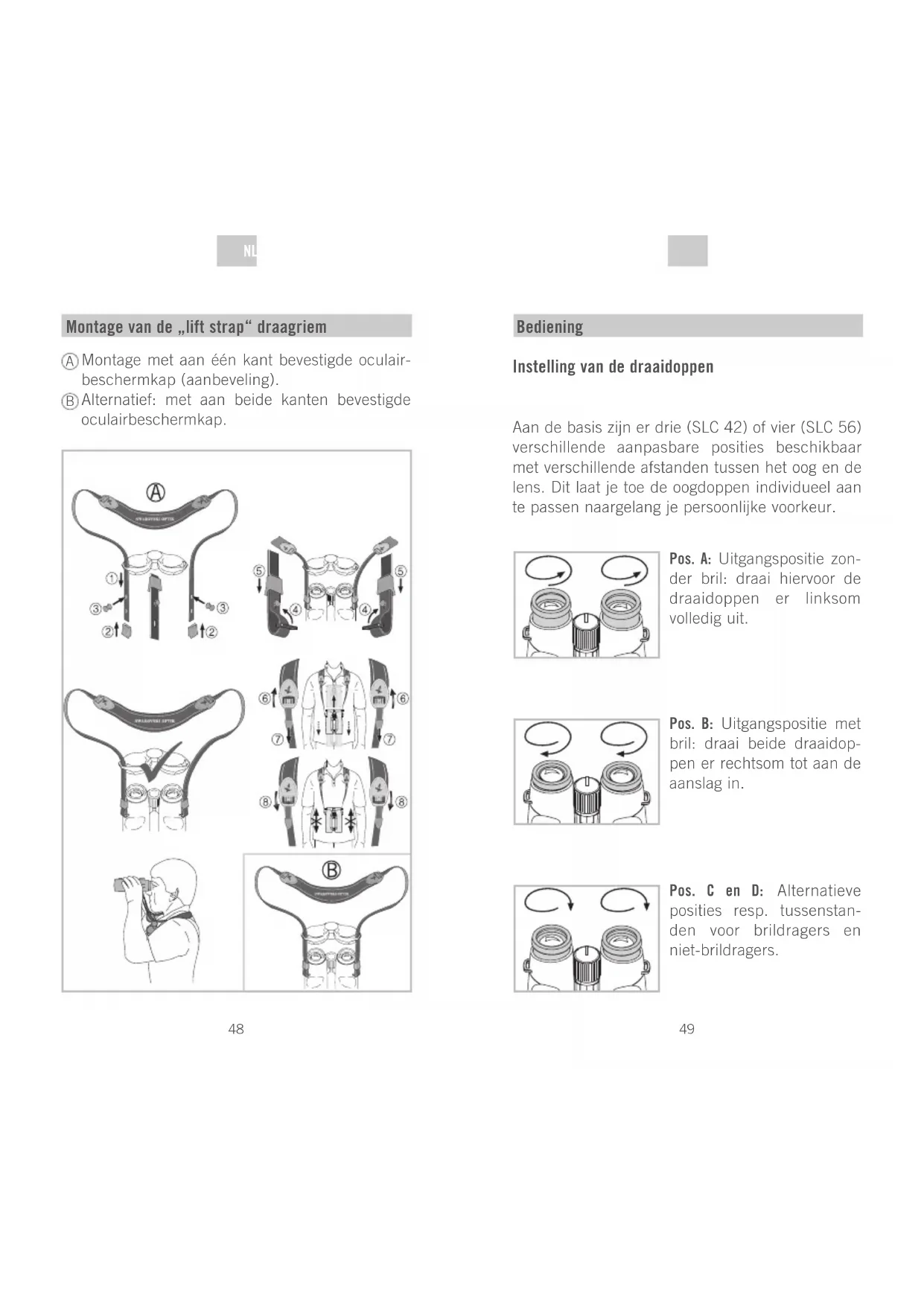 Bediening Instelling van de draaidoppen Aan de basis zijn er drie (SLC 42) of vier (SLC 56) verschillende aanpasbare posities beschikbaar met verschillende afstanden tussen het oog en de lens. Dit laat je toe de oogdoppen individueel aan te passen naargelang je persoonlijke voorkeur. Pos. A: Uitgangspositie zon- der bril: draai hiervoor de draaidoppen er linksom volledig uit. Pos. B: Uitgangspositie met bril: draai beide draaidop- pen er rechtsom tot aan de aanslag in. Pos. C en D: Alternatieve posities resp. tussenstan- den voor brildragers en niet-brildragers.51