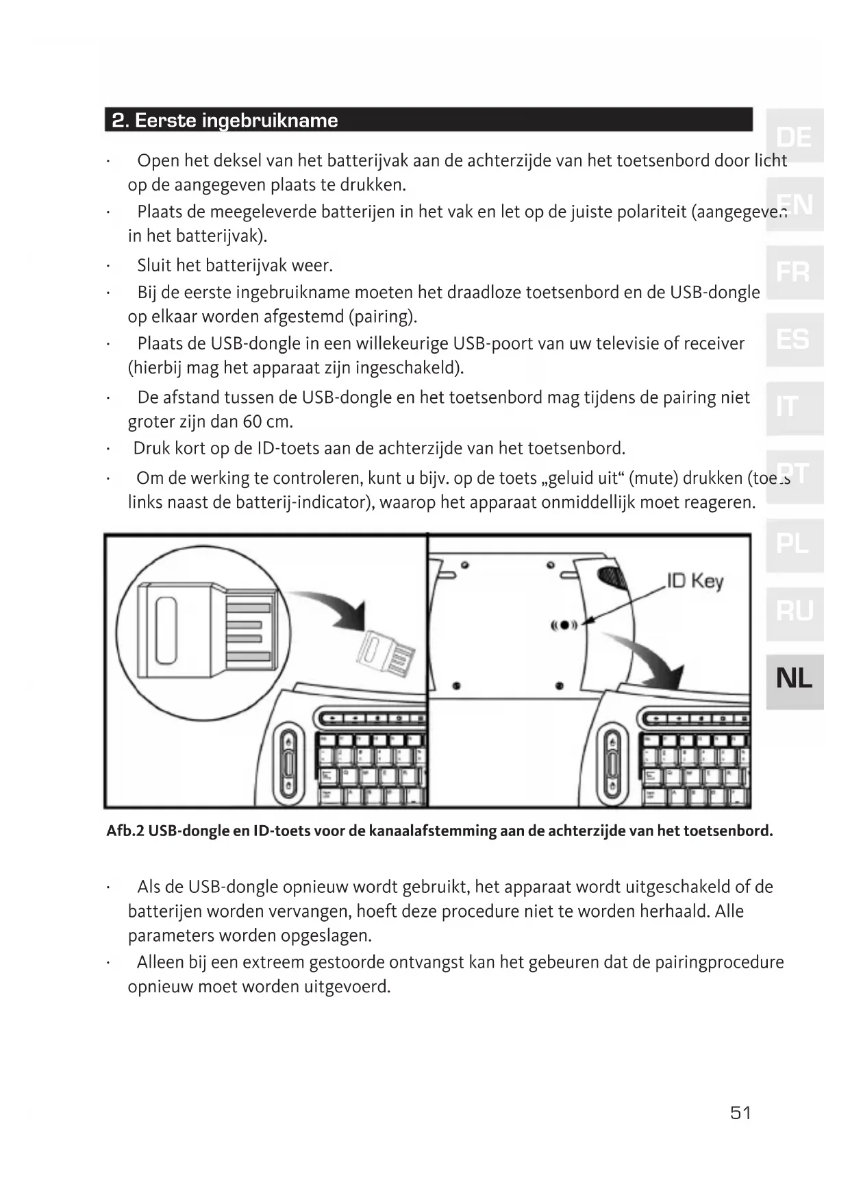 - Omdewerkingtecontroleren,kuntubijv.opdetoets„geluiduit“(mute)drukken(toets linksnaastdebatterij-indicator),waarophetapparaatonmiddellijkmoetreageren. Afb.2 USB-dongle en ID-toets voor de kanaalafstemming aan de achterzijde van het toetsenbord. · AlsdeUSB-dongleopnieuwwordtgebruikt,hetapparaatwordtuitgeschakeldofde batterijenwordenvervangen,hoeftdezeprocedureniettewordenherhaald.Alle parameterswordenopgeslagen. · Alleenbijeenextreemgestoordeontvangstkanhetgebeurendatdepairingprocedure opnieuwmoetwordenuitgevoerd.